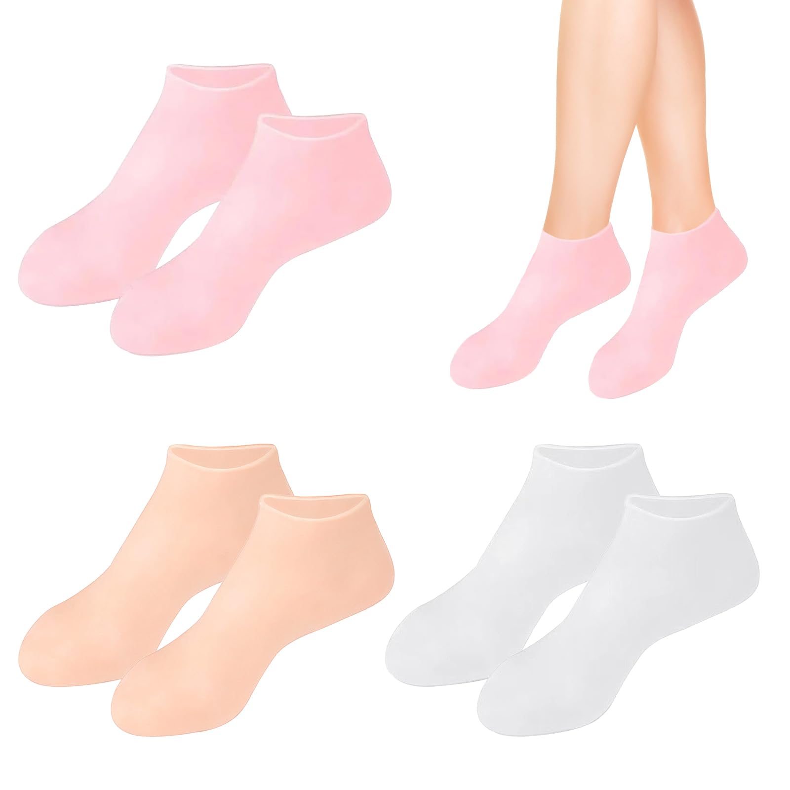Enhance your foot care routine with our silicone socks designed to soften calluses, repair cracked heels, and provide lasting comfort. Crafted for powerful moisturizing performance, these silicone socks ensure your feet stay smooth and hydrated. Constructed from a high-quality SEBS gel material, these silicone socks for women are gentle on the skin, hypoallergenic, and reusable. Perfect for home foot spa treatments or combating dry winter foot issues, they offer superior protection against pain, irritation, and discomfort. Instructions for usage are simple: clean your feet, apply foot cream, and wear the silicone moisturising socks for at least 25 minutes, 2-3 times a week. The flexibility, elasticity, and non-slip design make them suitable for most women, ensuring a secure fit and improved stability during use. Each pack includes 3 pairs of silicone socks for cracked feet in different colors, offering variety and functionality. Not only do these socks provide excellent foot care at home, but they also serve as waterproof accessories for outdoor activities like the beach. Say goodbye to cracked feet and welcome softer, healthier skin with our silicone socks. An ideal gift for loved ones, these socks cater to the needs of female foot care enthusiasts seeking comfort and rejuvenation. DIRECTIONS 1. Clean your feet. 2. Apply foot cream. 3. Wear the moisturizing socks for at least 25 minutes, 2-3 times a week.Versatile Use: Waterproof, moisture-proof, and wear-resistant, these silicone socks for cracked feet can be used at home or as waterproof socks for beach activities. Perfect gifts for girlfriends, wives, and mothers on birthdays, Thanksgiving, and Mother's Day. Non-Slip Design: Each set includes 3 pairs of silicone moisturizing socks in pink, skin tone, and white. Non-slip points on the bottom improve grip, stability, and balance, enhancing body control and reducing injury risks during use. Flexible Usage: Flexible, highly elastic, and non-deforming, our silicone socks for women wrap the entire foot well. Simply clean your feet, apply foot cream, and wear the moisturizing socks to treat calluses and chapped feet. Wear at least 2-3 times a week for optimal results. High-Quality Material: Made of super elastic SEBS gel material, our fsilicone socks for women are comfortable, skin-friendly and soft. Washable and reusable, they prevent dryness and cracking, providing continuous foot protection. Powerful Moisturizing: Silicone socks effectively soften hard calluses, repair cracked heels, and protect foot skin from pain and irritation. Experience smoother, more moisturized heel skin with our pedicure silicone socks.