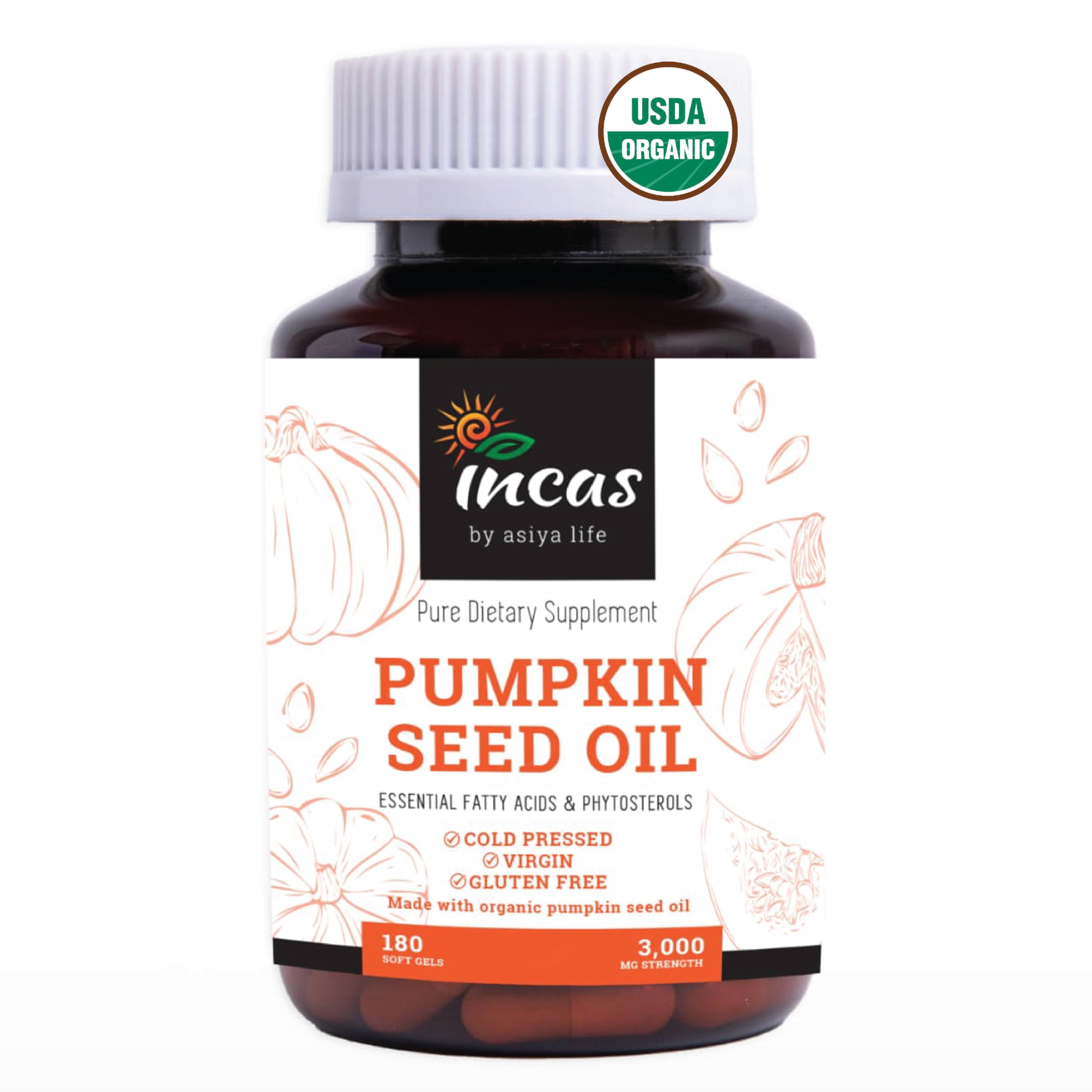INCAS Organic Certified Pumpkin Seed Oil, 3,000mg Per Serving, 180 Softgels | Cold Pressed, Pure Virgin Oil, Herbal Supplement | Supports Urinary, Bladder & Prostate Health | Non-GMO