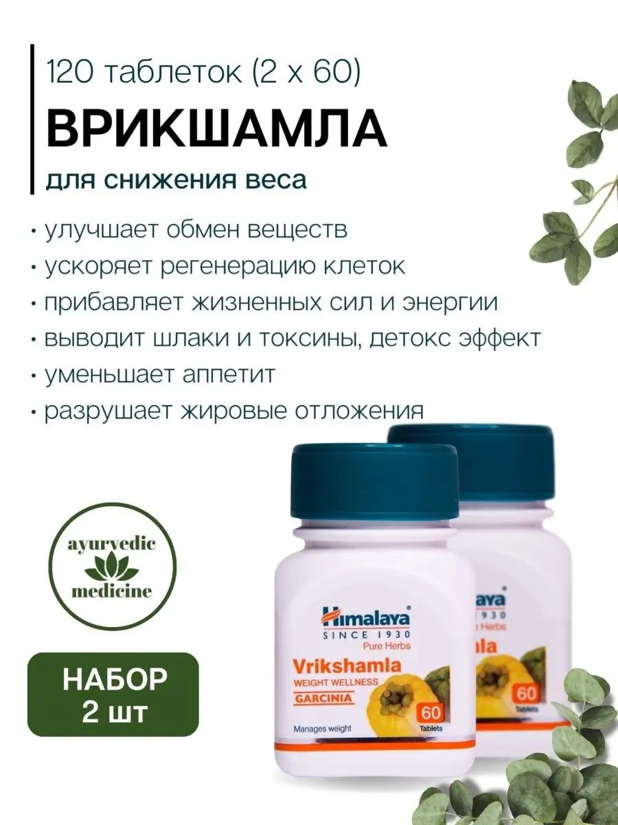 Врикшамла Хималая (Vrikshamla), 60 таблеток для снижения веса, похудения. Натуральный аюрведический препарат улучшает обмен веществ, ускоряет регенерацию клеток, детокс эффект – выводит шлаки и токсины, уменьшает аппетит, разрушает жировые отложения, в том числе целлюлит.