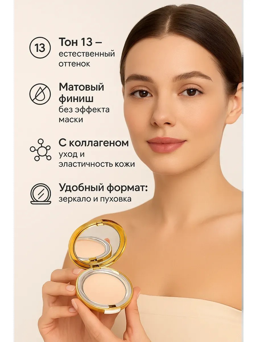 Компактная пудра для лица тон 13 ― это незаменимый продукт в косметичке каждой девушки, которая ценит идеальный макияж и натуральный вид кожи. Пудра создана на основе мягкой шелковистой текстуры, легко распределяется по коже и дарит ровный, матовый финиш без эффекта маски. Благодаря удобному формату с зеркалом и пуховкой средство подходит для быстрого подкрашивания в течение дня ― будь то в офисе, на учебе или во время поездки.