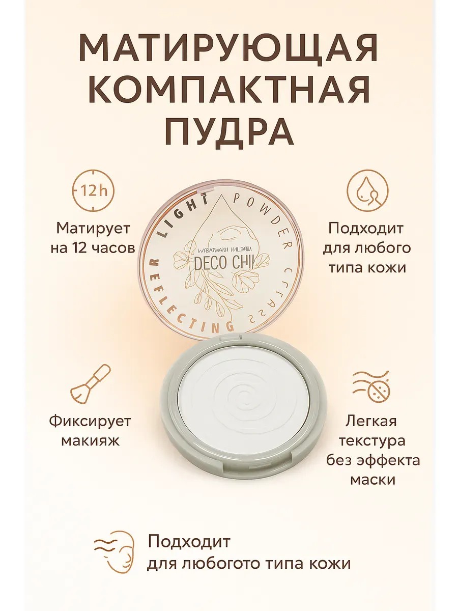 Матирующая компактная пудра – это незаменимый помощник в создании безупречного макияжа и идеального тона кожи. Легкая шелковистая текстура равномерно распределяется по лицу, не утяжеляя макияж и не создавая эффекта маски. Благодаря компактному формату пудра легко помещается в косметичку или сумочку, что позволяет всегда иметь под рукой средство для быстрого освежения образа.