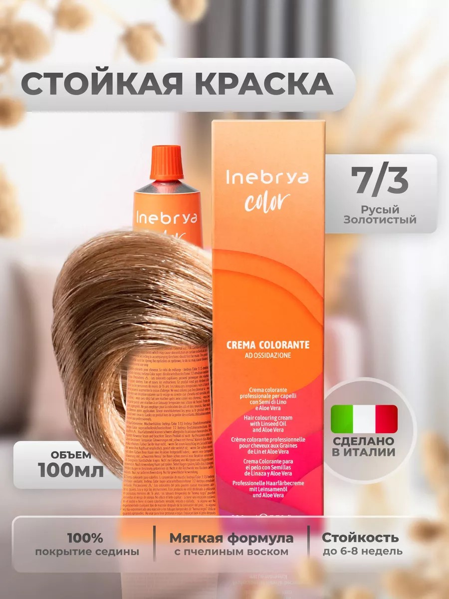 Inebrya Color Professional is an Italian professional permanent cream hair dye with a low ammonia content of up to 2%. It creates deep, rich light, dark, and medium blonde shades while maintaining the hair's quality. A nourishing complex of active ingredients (beeswax, aloe, shea butter, flaxseed oil, and coconut oil) leaves hair soft and shiny. A wide range of shades allows for any coloring or toning, from classic to creative. This light brown dye with a refined cocoa or coffee with milk hue will highlight your individuality. Its creamy texture makes it easy to apply and distribute throughout the hair, ensuring even color coverage. It doesn't run, making root coloring convenient. Micropigments easily penetrate the hair, effectively covering gray hair, and ensure color lasts for 6-8 weeks. Inebrya Professional Cream Hair Color is suitable for all hair types: natural, gray, and color-treated. This professional hair color can be used not only in the salon but also at home. Italian professional light hair color Inebrya Color Professional will be your reliable assistant in creating the perfect look. Aqua (water), cetearyl alcohol, petrolatum, polysorbate 80, propylene glycol, glycol distearate, citric acid, sorbitan stearate, ammonia, palmitic acid, cocamidopropyl betaine, oleyl alcohol, laureth-3, cera alba beeswax, butyrospermum parkii butter shea butter, aloe barbadensis leaf juice, linum usitatissimum linseed seed oil, cocos nucifera coconut oil, sorbitan oleate, ceteareth-20, hydrogenated castor oil, tetrasodium edta, sodium hydrosulfite, sodium sulfite, ascorbic acid, pentasodium pentetate, potassium sorbate, sodium benzoate, citric acid, simethicone, resorcinol, toluene 2.5 diamine sulfate, 2 methylresorcinol, 2.4 diaminophenoxyethanol hcl, m-aminophenol, hexyl cinnamal, limonene, parfum.