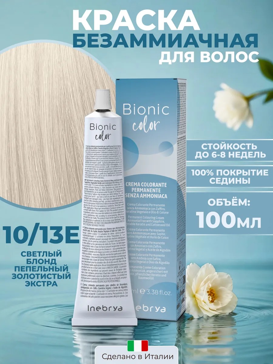 Inebrya Bionic — это итальянская профессиональная перманентная крем краска для волос без аммиака. Она позволяет получить глубокие и насыщенные светлые оттенки волос, при этом сохраняя их качество. Ухаживающий комплекс активных питательных компонентов (кератин, коллаген, сапфировая пудра и масло хлопка) делает волосы мягкими и блестящими. Большая палитра оттенков позволяет сделать любое окрашивание или тонирование, от классического до креативного. Светлый тон белой краски благородно подчеркнет вашу индивидуальность. Выберите оттенок бежевый блондин или светло русый в натуральном ряде или с цветовыми нюансами. Деликатная, щадящая формула позволяет окрашивать волосы в яркие насыщенные цвета со стойкостью до 6-8 недель, при этом обеспечивая 100 % закрашивание седых волос. Благодаря своей кремовой текстуре, краситель легко наносится и распределяется по волосам, что позволяет добиться равномерного окрашивания. Она не течет, что делает окрашивание корней волос удобным. Микропигменты легко проникают в волос, что эффективно для закрашивания седины. Стойкая крем краска профессиональная Инебрия подходит для всех типов волос: натуральных, седых и окрашенных. Проф краска для волос может использоваться не только в салоне, но и в домашних условиях. Итальянская профессиональная краска для волос Inebrya Bionic блонд станет вашим надёжным помощником в создании идеального образа.