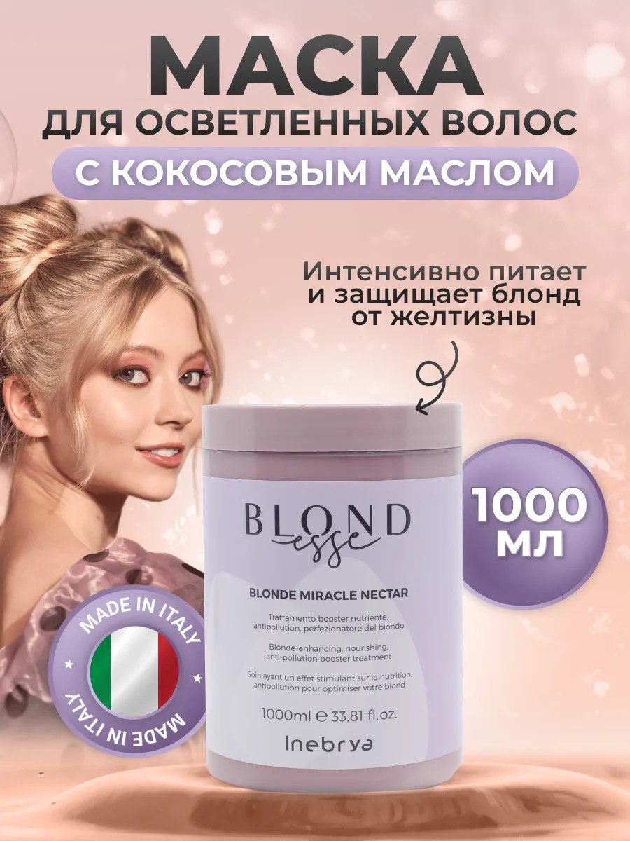 Dreaming of beautiful, healthy, and shiny hair? If your hair has been damaged by bleaching, you need a mask for dry and damaged hair. A nourishing mask for bleached hair will help restore the structure of your hair after coloring or bleaching, moisturizing and nourishing it, making it soft and silky. A mask for bleached and highlighted hair is a professional treatment suitable for all hair types to combat brassiness. It contains natural ingredients that nourish hair from the inside out, restore its structure, and add shine. A mask for colored blonde hair helps preserve the color of light-colored hair. If you want your hair to look healthy and beautiful, a nourishing mask is what you need. This cream mask for light-colored hair is suitable for both natural blondes and those who want to maintain a beautiful shade after coloring. Blondesse mask is the ideal treatment for dry and brittle hair. A nourishing mask for bleached hair is a product that will help restore your hair's health after bleaching. Suitable for porous and split-end hair, this mask contains nutrients that strengthen curls. By choosing a nourishing mask for removing brassiness, you're choosing high-quality hair care. This product will help you maintain the beauty and health of your hair for years to come. The mask has a fragrant scent and a generous 1-liter capacity—use it as a conditioner or balm. Ingredients: Aqua (Water), Cetearyl Alcohol, Cetrimonium Chloride, Behentrimonium chloride, Phenoxyethanol, Betaine, Butyrospermum Parkii Butter (Butyrospermum Parkii (Shea) Butter), Erythritol, Aloe Barbadensis Leaf Juice, Parfum (Fragrance), Hydroxypropyl Starch Phosphate, Sodium Gluconate, Isopropyl Alcohol, Ethylhexylglycerin, Benzyl Salicylate, Cocos Nucifera Oil (Cocos Nucifera (Coconut) Oil), Citric Acid, Potassium Sorbate, Sodium Benzoate, Sodium Sulfite.
