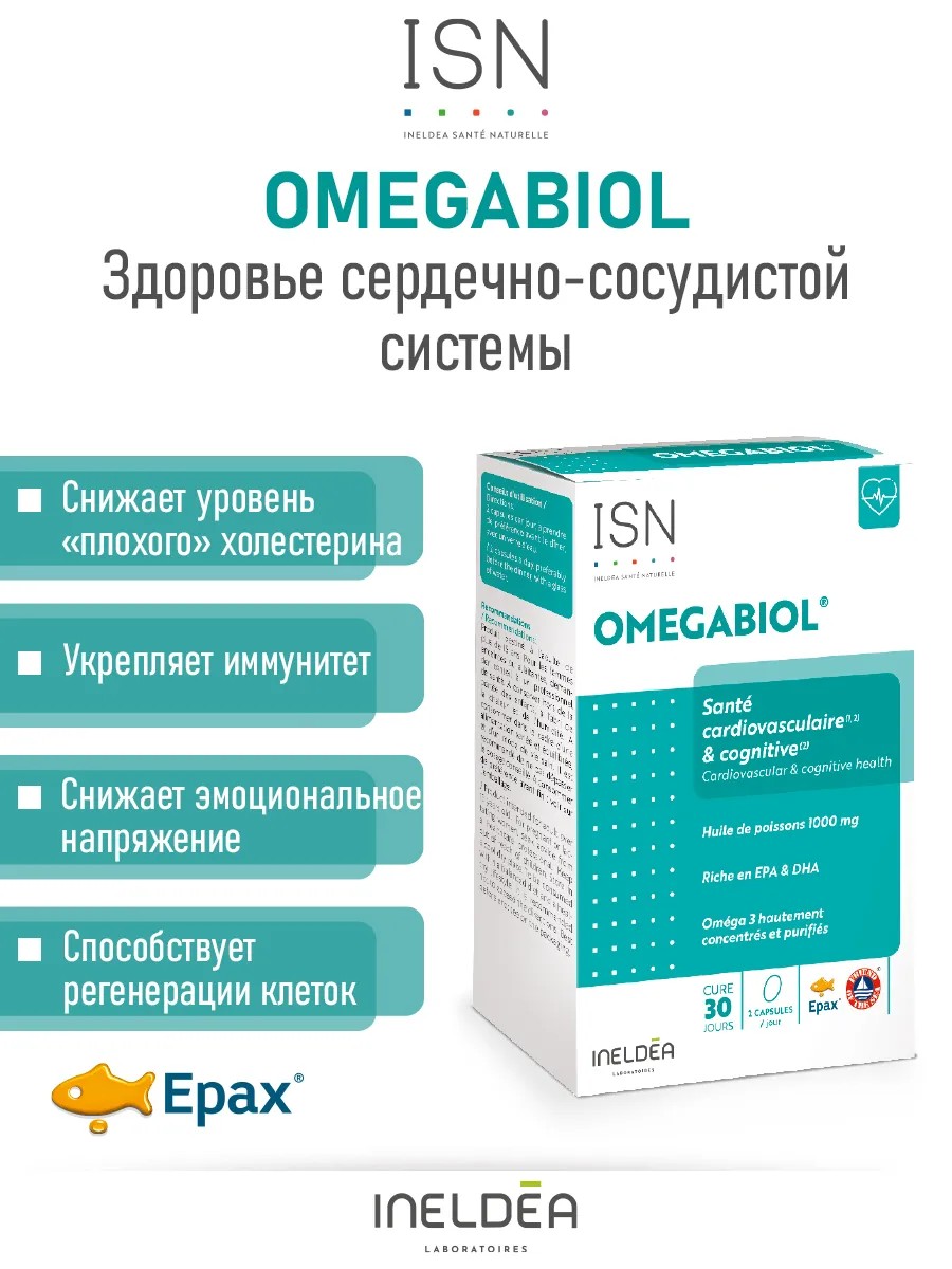 Омегабиол — это комплекс, состоящий из трех видов очищенных масел, которые являются источниками Омега-3 EPA и DHA. Эти жирные кислоты Омега-3 играют важную роль в нормализации сердечных функций. DHA, в частности, способствует поддержанию нормального уровня триглицеридов в крови.