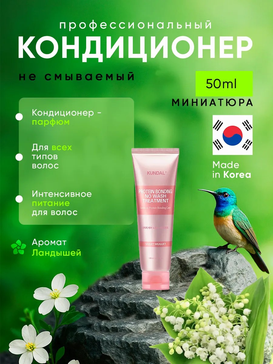 Маска миниатюра для волос несмываемая с термозащитой PROTEIN BONDING NO WASH TREATMENT 50ML (KUNDAL) с ароматом ландышей (VIOLET MUGUET).