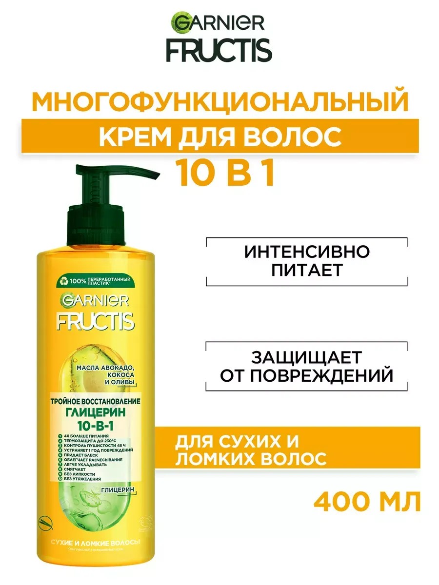 10-В-1 решение для сухих волос от Garnier - Гарньер. Легкая текстура комплексного несмываемого крема от Fructis - Фруктис, обогащенная маслами авокадо, кокоса, оливы и питательными липидами, питает волосы и защищает их от повседневных повреждений, вызванных расчесыванием, сушкой феном и укладкой горячими приборами.
