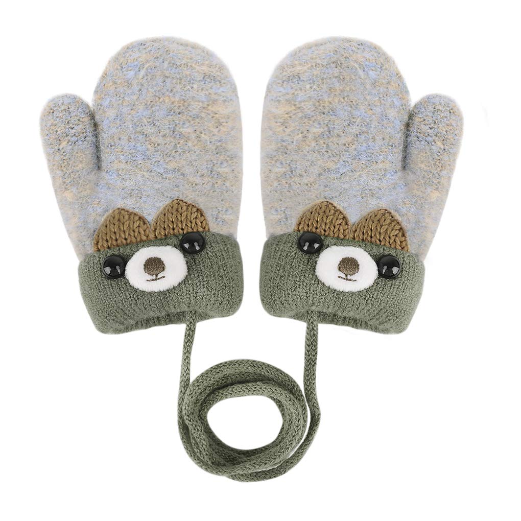 Infant Toddlers Lovely Mittens Winter Warm Cute Cartoon Gloves Dual Layers Plush Padded Knitted Gloves Mittens With Anti-Lost String for Baby Girls Boys 0-3 Years Old Grey