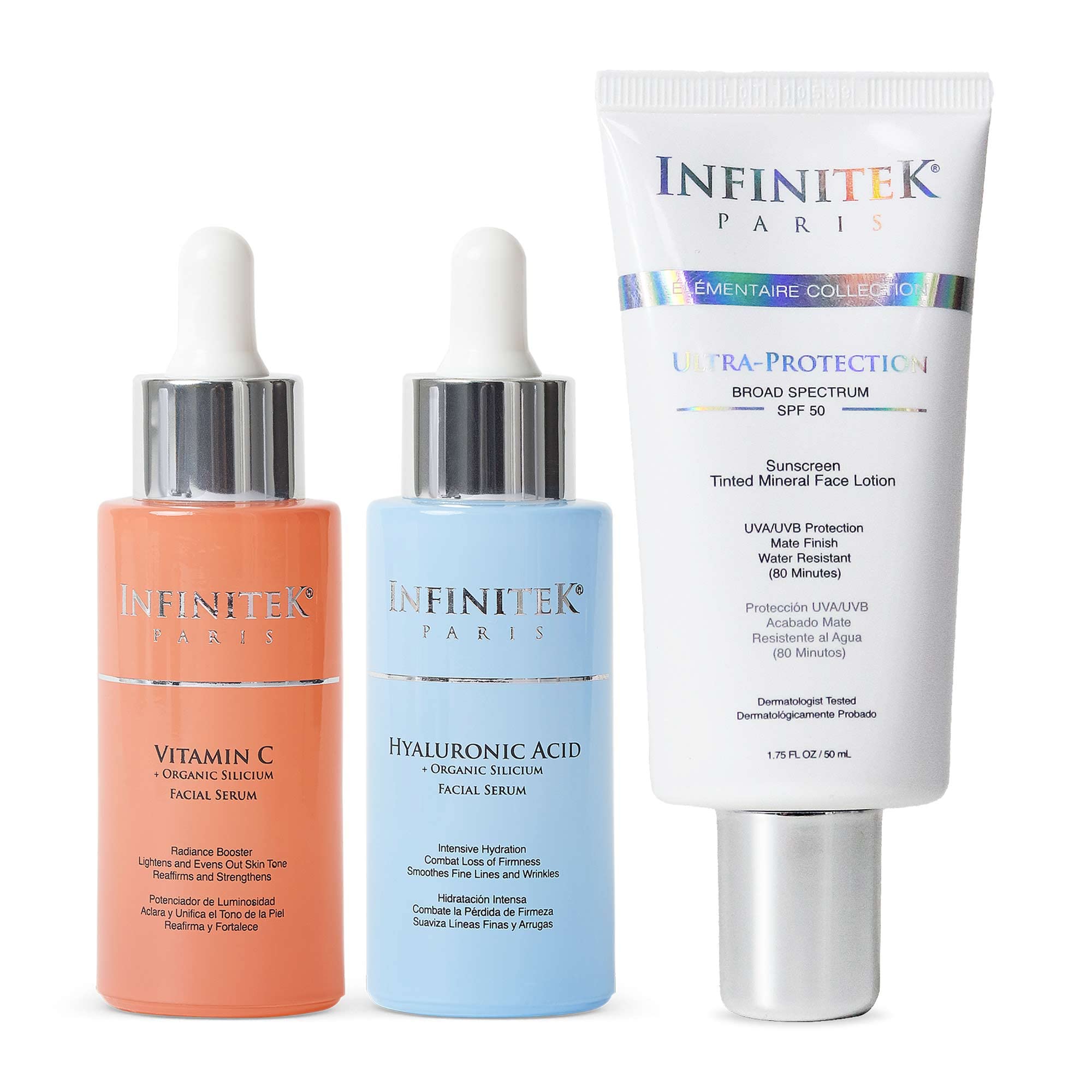 3 essential products to enhance your natural beauty. Your skin will love them! Softens, hydrates, firms, protects, illuminates, clarifies and evens out the skin tone. What are you waiting for? Try them now! Visible results in days or weeks. Contains dermatologically tested active ingredients. Our Essential Kit contains 3 essential products for a daily skin care routine. Vitamin C Organic Silicium Serum. Formulated with Vitamin C, E and Ferulic Acid to maximize its antioxidant action. Strengthens the skin, combats the effects of free radicals, pollution and sun damage, the main causes of premature aging. It acts as a radiance enhancer, improving and brightening the skin tone, revealing a renewed, radiant and youthful skin. Hyaluronic Acid Organic Silicium Serum. Provides intense and long-lasting hydration. Diminishes and prevents the appearance of wrinkles and fine lines. Visibly improves thickness and texture making the skin denser, more resistant and flexible. Ultra-Protection SPF 50 Sunscreen: 100 mineral formula, provides broad spectrum protection against UVA, UVB and Blue Light, preventing and improving signs of aging such as wrinkles, blemishes, and the risk of skin cancer. Works as a Facial Primer with matte finish and is water resistant (80 minutes). Our serums contain Organic Silicium, an incredible Active ingredient that helps increase the production of collagen and elastin in the skin. Firms and delays the appearance of signs of premature aging such as spots, wrinkles and dehydration.PROTECTION: Skincare products and sunscreen for sensitive skin treatment may be rough on your skin. Our product s ingredients reduce the risks of using these facial skincare products. Great gift for women that have everything. Comfortable fit in makeup bags. PERKS AND DETAILS: Our face serums are not a sugar scrub, do not contain healing crystals, or rose quartz, but may prepare your skin for them. Must have Vitamin C serum, Vitamin E oil, or a facial steamer combination. It will ease the road for maximum lighting and a cleaner effect. BEAUTY PRODUCTS: Combine the usage with beauty personal care proactive items. Have a Gua Sha massage tool? It goes along with it. Anybody lotion, neck massager, or face steamer machine? Discover the benefits of our complete treatment. Your skincare sets kits should include a variety of items for cleansing. BENEFITS: The ordinary SPF 50 lotion may be rough in the skin. Our mineral sunscreen for face protection has the appropriate balance to minimize the clay face mask sensation. The perfect combination of Hyaluronic Acid, Vitamin c, Organic Silicium and Hydroxyproline. Easy to carry anti-aging products. SKIN CARE PREPARATION: Facial light serums. Apply them directly to your face (closing your eyes) and neck. When the skin absorbs it, it prepares your body for the skin care products such as moisturizer for dry skin or oily skin. Infinitek offers skincare products that fight signs of aging . 1 or 2 times per day.