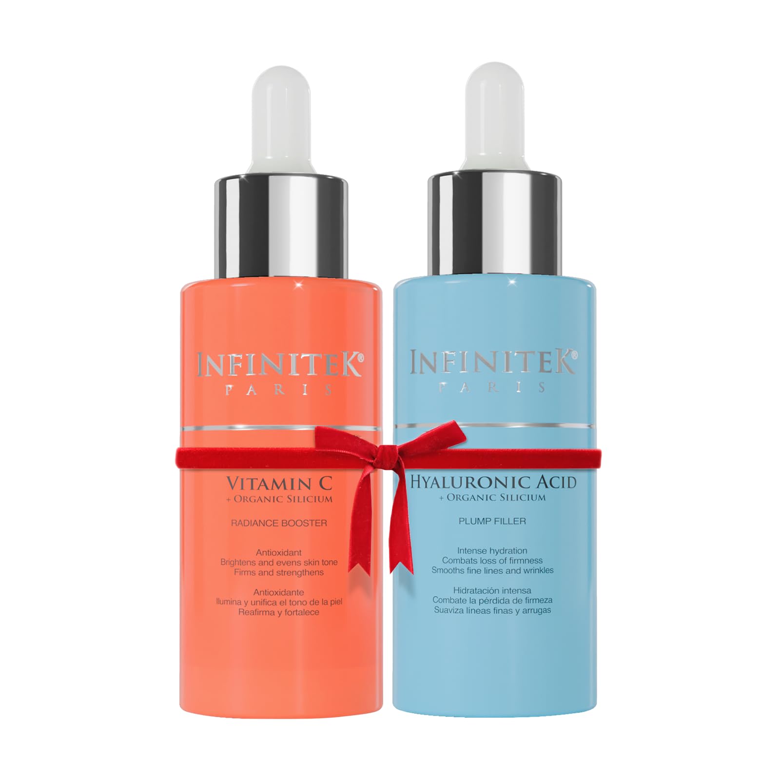 Our Best-Sellers. The Perfect Duo to prevent and combat premature aging signs! It is ideal for brightening, hydrating, firming and unifying the skin tone, revealing a healthier and more youthful appearance. Developed with Silanol technology, you will notice changes in days or weeks. Contains dermatologically tested active ingredients. What are they for? Hyaluronic Acid Organic Silicium Serum, provides intense and long-lasting hydration. Visibly improves the thickness and texture of the skin for a denser, stronger and more flexible appearance, while at the same time firms, smooths and softens. We know how important it is to take care of our skin against free radicals, pollution and sun damage, our PERFECT DUO contains the Vitamin C Organic Silicium Serum, a powerful antioxidant that will help protect your skin from these factors! You must be wondering why it is the PERFECT DUO and we are here to answer your questions. Our exclusive formulas with Silanol technology, improves the effects of Hyaluronic Acid and Vitamin C on the skin, allowing real results in a short period of time. They are highly concentrated and light in texture which allows the product to penetrate into the deepest layers of the skin. But the best part of our PERFECT DUO is that is made for all skin types, they do not contain parabens, fragrances, or coloring, making them ideal for you.PROTECTION: Face masks, skin care products, and sunscreen for sensitive skin treatment may be rough on your skin. Our products reduce the risks of using these facial skincare products. Great gift for women that have everything. Comfortable fit in makeup bags. PERKS AND DETAILS: Our face serums are not a sugar scrub, do not contain healing crystals, or rose quartz, but may prepare your skin for them. Must have Vitamin C serum, Vitamin E oil, or a facial steamer combination. It will ease the road for maximum lighting and a cleaner effect. BEAUTY PRODUCTS: Combine the usage with beauty personal care proactive items. Have a Gua Sha massage tool? It goes along with it. Anybody lotion, neck massager, or face steamer machine? Discover the benefits of our complete treatment. Your skincare sets kits should include a variety of items for cleansing. BENEFITS: Our face serum has the appropriate balance to minimize the clay face mask sensation. It will optimize the use of ordinary peeling solutions, facial moisturizers, night cream, or even blackhead remover solutions. Easy to carry products fighting aging signs. SKIN CARE PREPARATION: Facial light serums. Apply them directly to your face (closing your eyes) and neck. When the skin absorbs it, it prepares your body for the skin care products such as moisturizer for dry skin or oily skin. Infinitek offers skincare products that fight signs of aging . 1 or 2 times per day.