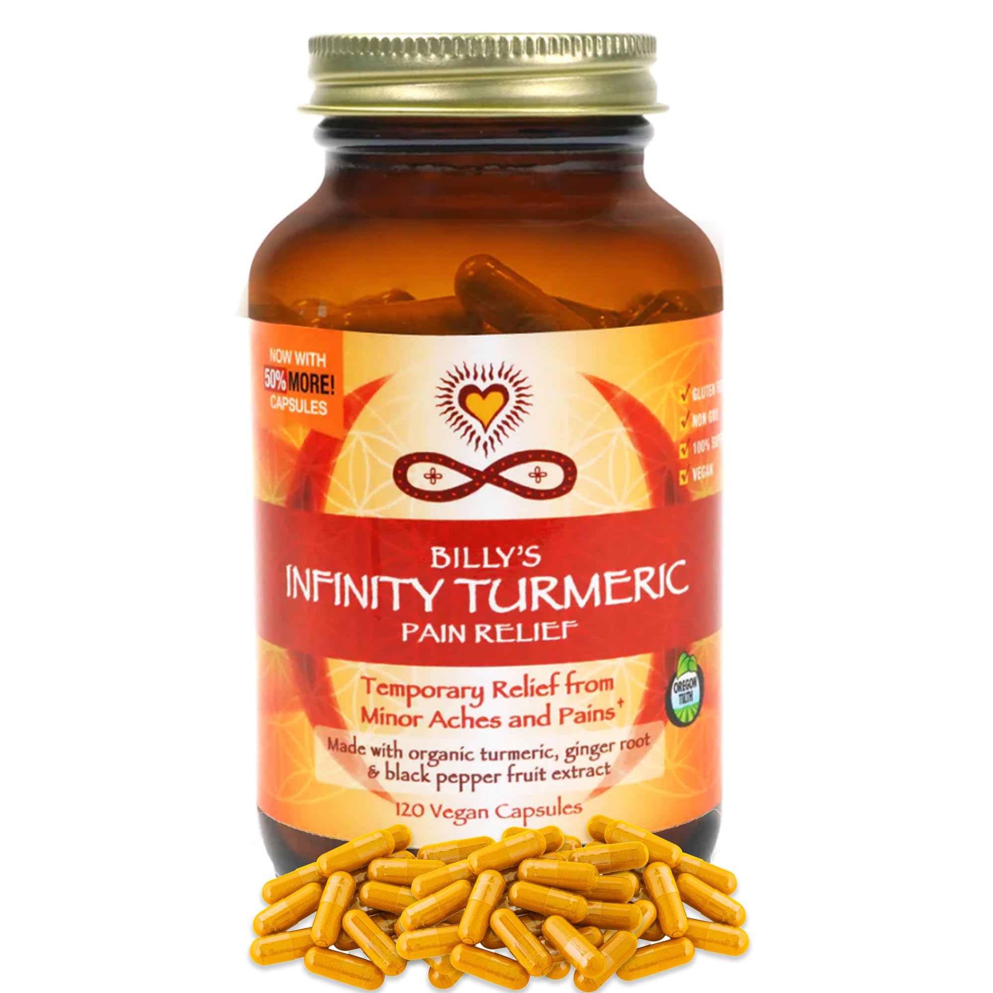 THE INFINITY DIFFERENCE : At Infinity, we're committed to providing the highest quality, most nutrient dense superfoods on the planet. Our organic turmeric capsules are completely free from fillers and come packed in a premium amber glass jar that maximizes shelf life without exposing you to plastic or petroleum. TRIPLE TESTED FOR QUALITY AND PURITY : Don't risk it with untested, under-delivering turmeric pills. Every ingredient in our organic turmeric supplement is stringently tested for quality, purity, and nutritive content in three separate trials (once at our own establishment and twice at reputable 3rd party labs). RAW VEGAN ORGANIC : The plants and herbs used in our tumeric and curcumin supplements are carefully selected from certified growers. At Infinity Greens, we're committed to using the highest quality ingredients possible that are always raw, vegan, gluten free, non GMO, and are either USDA certified organic or wild harvested from their native environment. BIO-ENHANCING HERBAL BLEND : Our organic turmeric curcumin supplement features a synergistic blend of piperine black pepper extract and ginger. Clinical studies suggest that combining organic turmeric with black pepper and ginger can enhance the body's absorption of health transforming nutrients by up to 2,000 . HIGH POTENCY TURMERIC : Our premium turmeric supplement is crafted with a precision blend of USDA certified organic turmeric root extract, organic black pepper extract, and organic ginger. Each serving is rich in bioactive compounds that support health, boost immunity, and promote overall wellness.