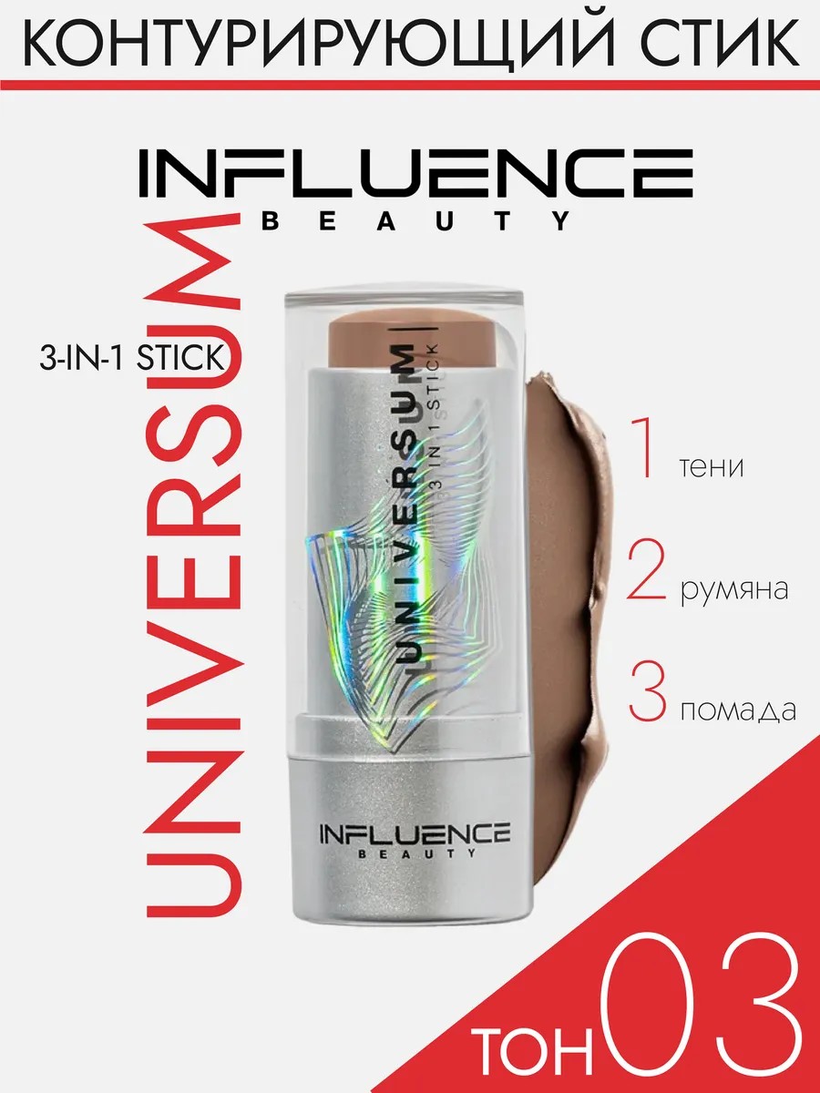 Универсальный стик UNIVERSUM от INFLUENCE BEAUTY можно использовать для макияжа лица, глаз и губ. Уникальная гипоаллергенная текстура MULTIPURPOSE сливается с кожей, не подчеркивая ее несовершенства и рельеф, и может быть использована для макияжа любой зоны лица без опасений за слизистую рта или глаз. Стик 3 в 1 UNIVERSUM в компактном формате заменяет сразу несколько продуктов — все для макияжа лица в одной упаковке. В ассортименте четыре тона: бледно-коричневый 01 — для четких линий и скульптурирования лица, нейтральный коричневый 02 — для естественного макияжа на каждый день, тауп 03 — для контуринга с эффектом натурального загара, натуральный розовый 04 — для естественного румянца. Продукция не тестируется на животных и не содержит компоненты животного происхождения.