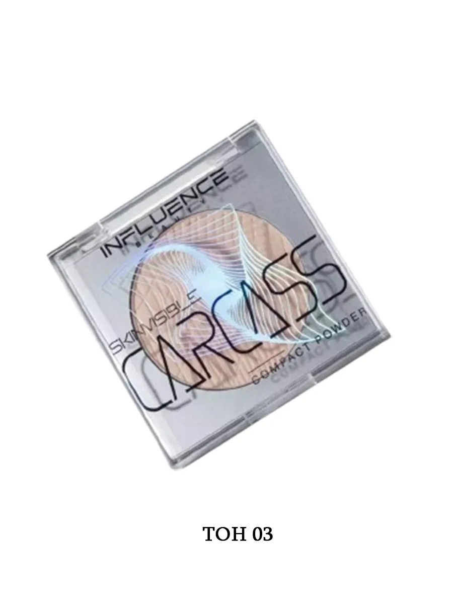 SKINVISIBLE CARCASS face powder from INFLUENCE BEAUTY is the perfect product for creating beautiful makeup. Its lightweight, innovative texture evens out skin tone, providing a natural, smooth finish. This mattifying loose powder, in shade 03, is perfect for anyone striving for flawless beauty: it can be used to set makeup or create a matte finish with a subtle satin sheen. Thanks to POLYPRESS technology, this women's makeup product is pressed in multiple steps, preventing cracking and ensuring even application. Using SKINVISIBLE CARCASS makeup powder will leave your skin looking as natural as possible, eliminating shine. Apply this weightless compact powder over foundation to give skin a matte finish and set your makeup. The range includes four mattifying powder shades, ranging from light to beige, allowing you to find the perfect tone for any skin type. This compact setting powder perfectly mattifies and refreshes, leaving skin smooth and velvety, making it an essential part of your makeup kit. It perfectly evens out skin tone and creates a matte finish, while being cruelty-free—the product is not tested on animals and does not contain animal-derived ingredients. HOW TO USE: After your skincare routine, apply a small amount of powder with a puff or brush. The powder can be used under foundation as a makeup base. For instant makeup setting, use the HYDRA or MATTE Setting Spray from INFLUENCE BEAUTY.