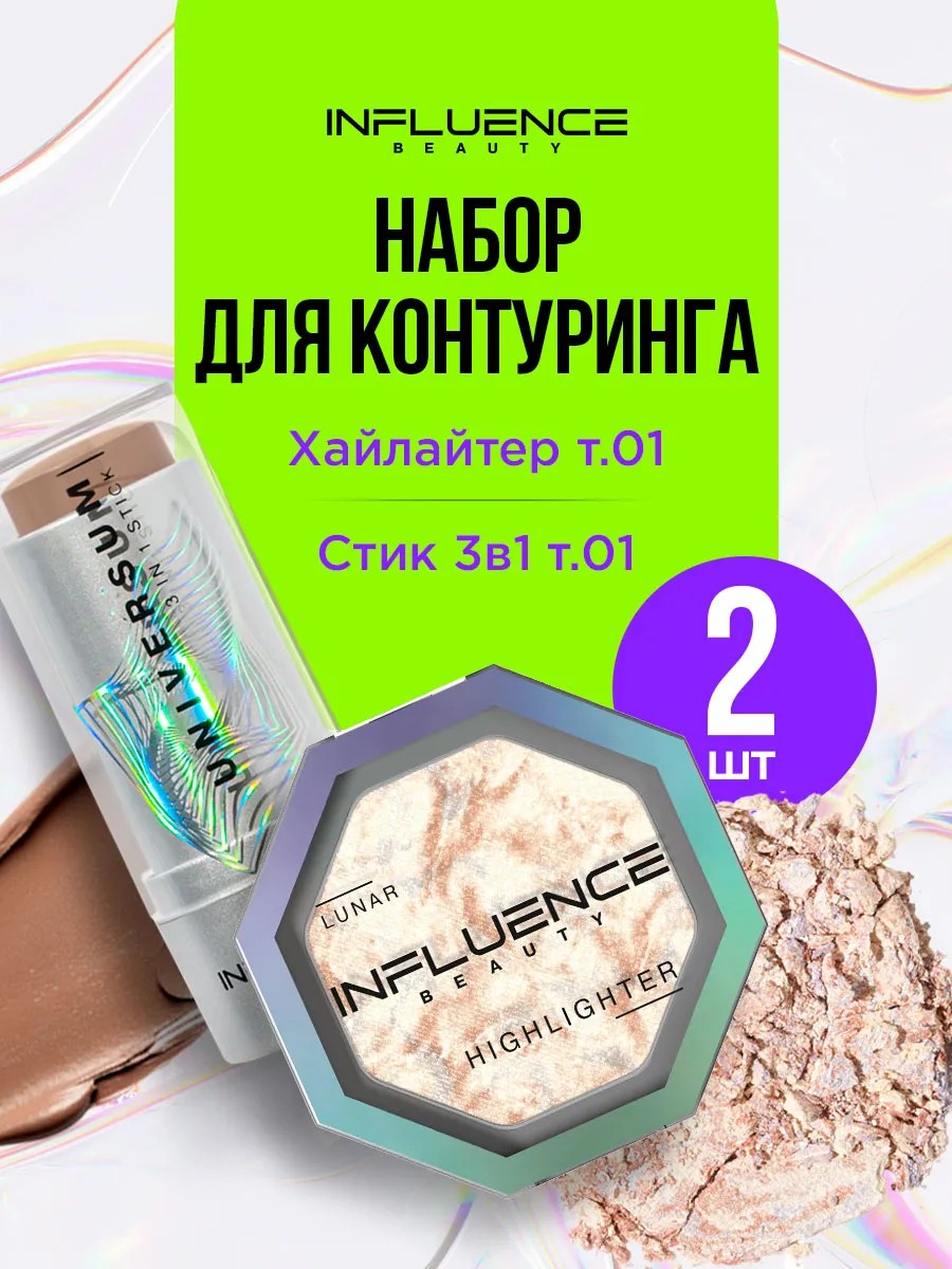 Набор для макияжа лица в подарок: Influence Beauty Хайлайтер Lunar т.01 + Стик 3в1 Universum т.01 бледно-коричневый - подарок на 8 марта, Новый год, день рождения.