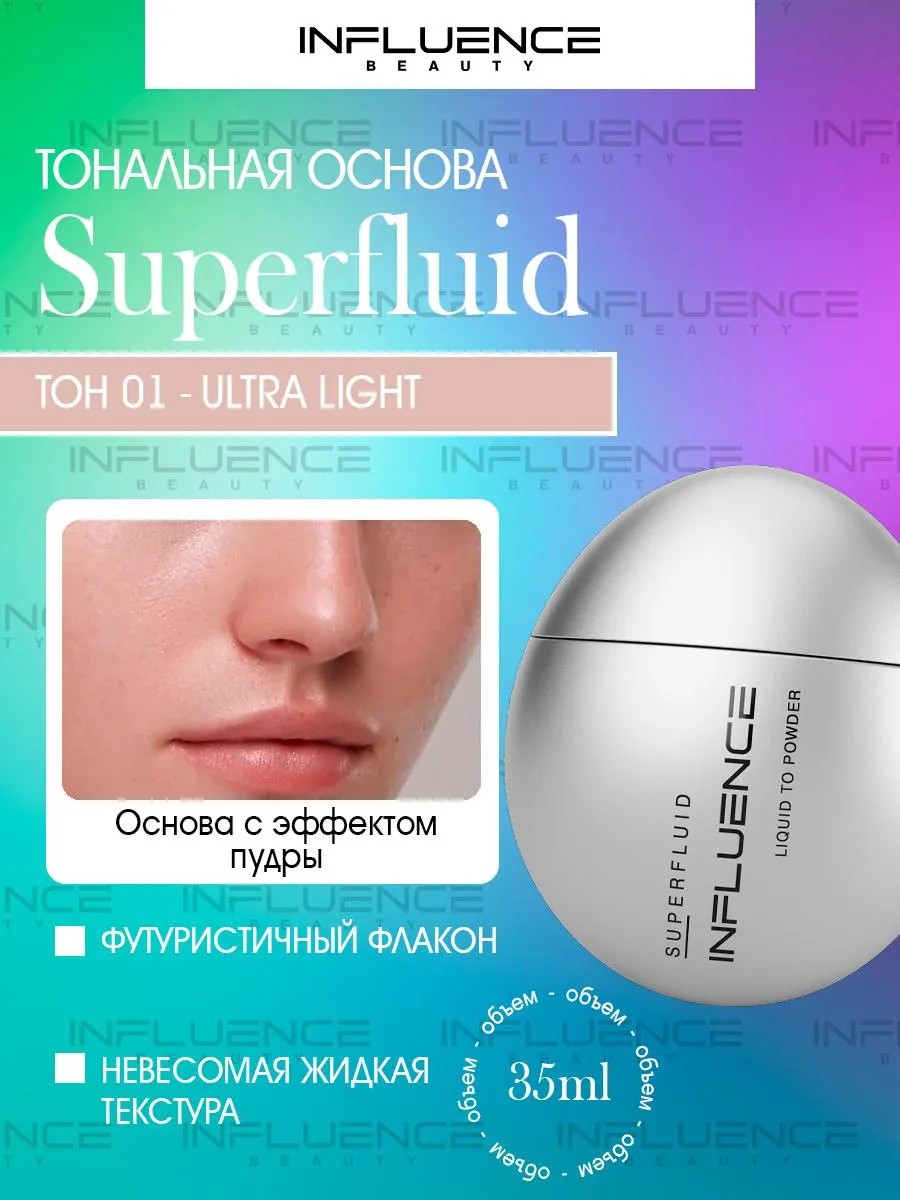 SUPERFLUID от INFLUENCE BEAUTY — тональная основа с эффектом пудры, вдохновленная невесомостью супержидкостей. Нанесите ее на лицо, чтобы придать коже матовый финиш. Благодаря технологии LIQUID TO POWDER крем создает покрытие с эффектом припудренной кожи. Он выравнивает рельеф, маскирует поры и несовершенства на лице. У средства технологичный обтекаемый флакон футуристичной формы с покрытием soft-touch, который приятно держать в руке. Упаковка имеет большой объем — 35 мл. В линейке пять оттенков с разным подтоном. SUPERFLUID с невесомой жидкой текстурой легко распределяется по коже и оставляет бархатный финиш без жирного блеска на весь день.