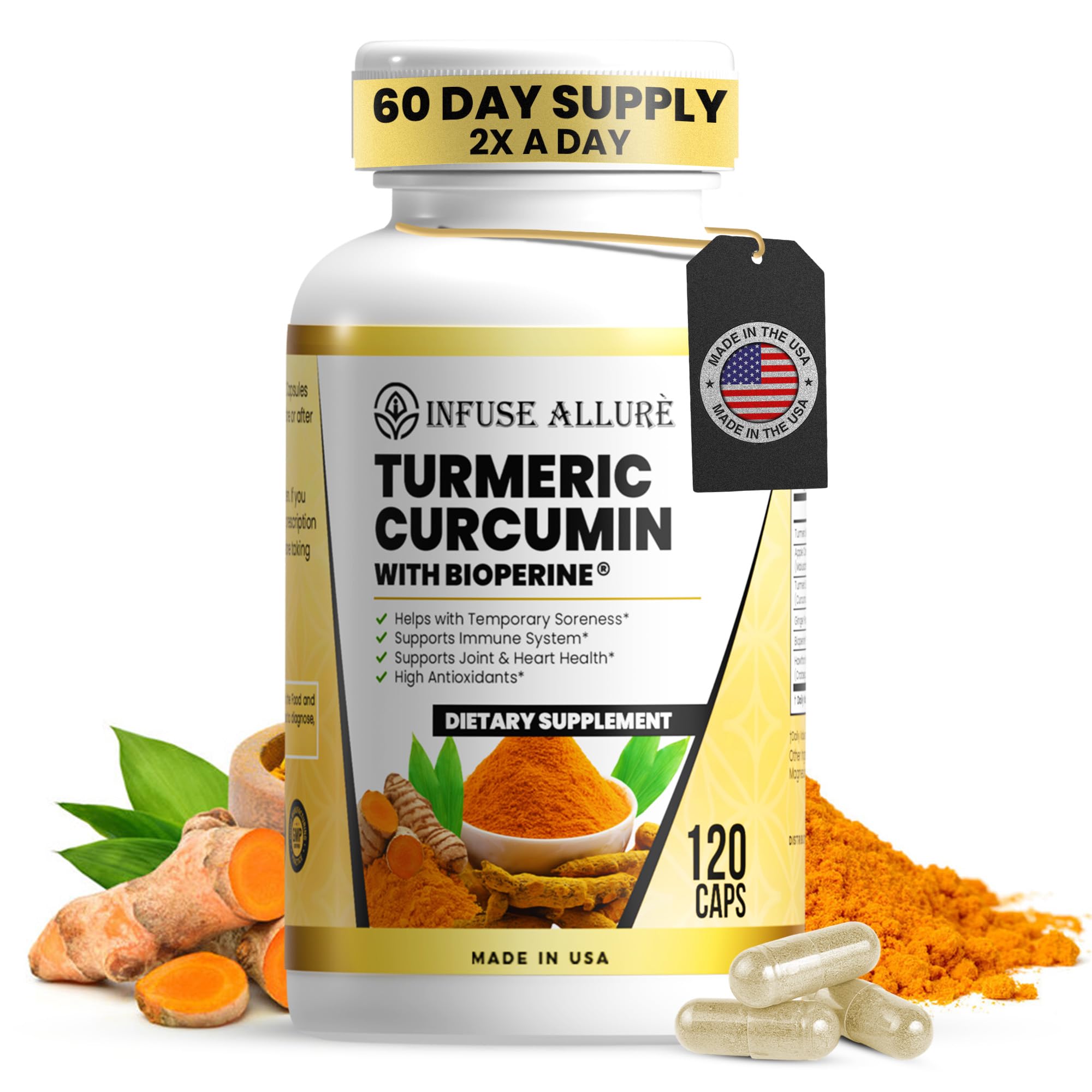 Infuse Allur - Turmeric Curcumin & Bioperine Vegetable Capsules - Premium Antioxidant Supports Brain & Heart Health Skin & Digestion - Promotes Cellular Health - 120 Caps