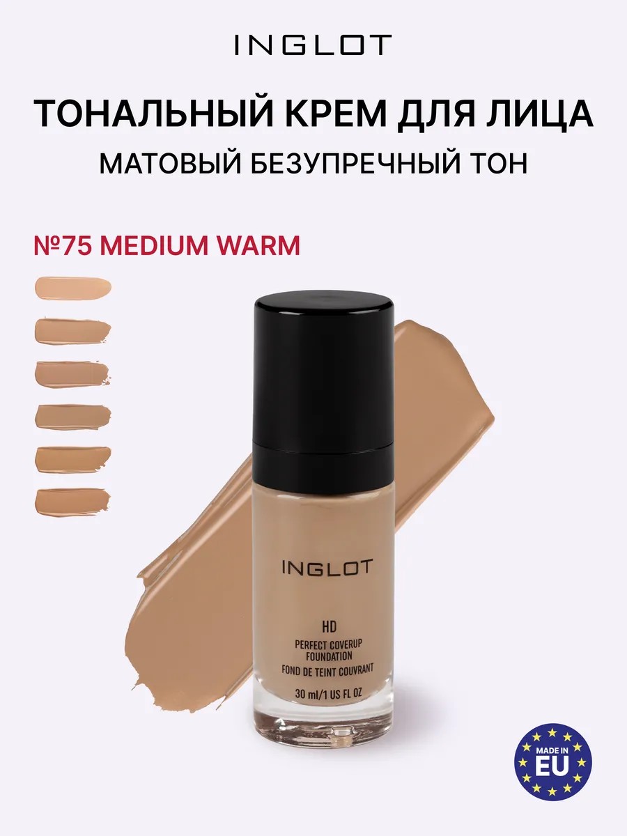 Достигните эффекта безупречной кожи HD! Тональный крем Inglot HD PERFECT COVERUP FOUNDATION в оттенке 71 Светло-бежевый – ваш секрет идеального матового тона с плотным, но естественным покрытием. Эта высокопигментированная тональная основа для лица профессионально маскирует любые недостатки: пигментацию, покраснения, неровности рельефа. Формула мгновенно выравнивает тон, создавая эффект "фотошопа" не только на фото и видео в высоком разрешении (HD), но и в реальной жизни. Благодаря матирующим свойствам, она надежно контролирует жирный блеск на протяжении многих часов, обеспечивая стойкое покрытие без ощущения маски.