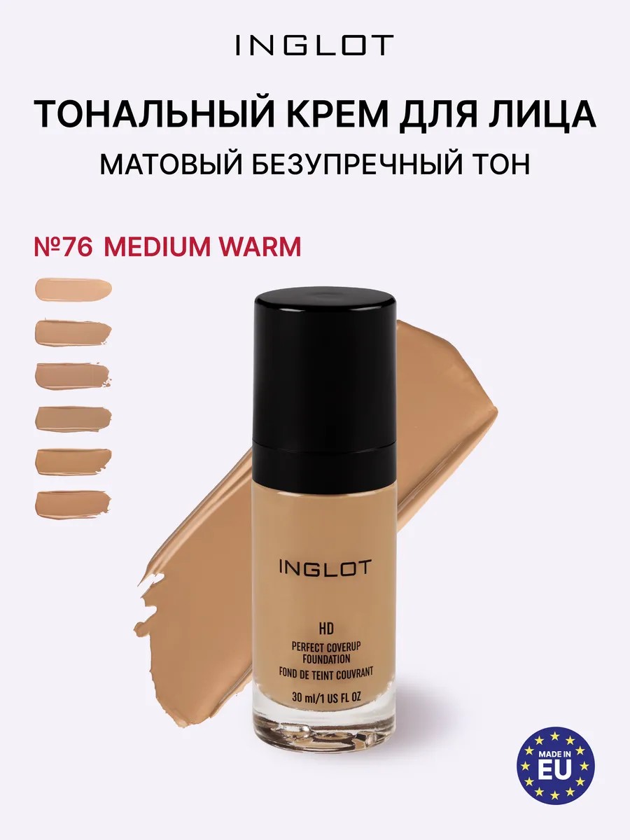 Обретите идеальный тон с классическим бежевым оттенком! Тональный крем Inglot HD PERFECT COVERUP FOUNDATION в оттенке 76 Бежевый (Beige) – ваш надежный выбор для создания естественного и безупречного покрытия на светлой и средней коже с нейтральным подтоном. Эта высокопигментированная тональная основа обеспечивает плотное покрытие, мгновенно маскируя несовершенства, покраснения и неровности. Светорассеивающие HD-пигменты творят чудеса: они визуально сглаживают текстуру кожи, минимизируют поры и создают эффект "фотошопа" в реальной жизни и под прицелом HD-камер. Формула гарантирует стойкий матовый результат (12+ часов), контролируя жирный блеск без ощущения тяжести или маски.