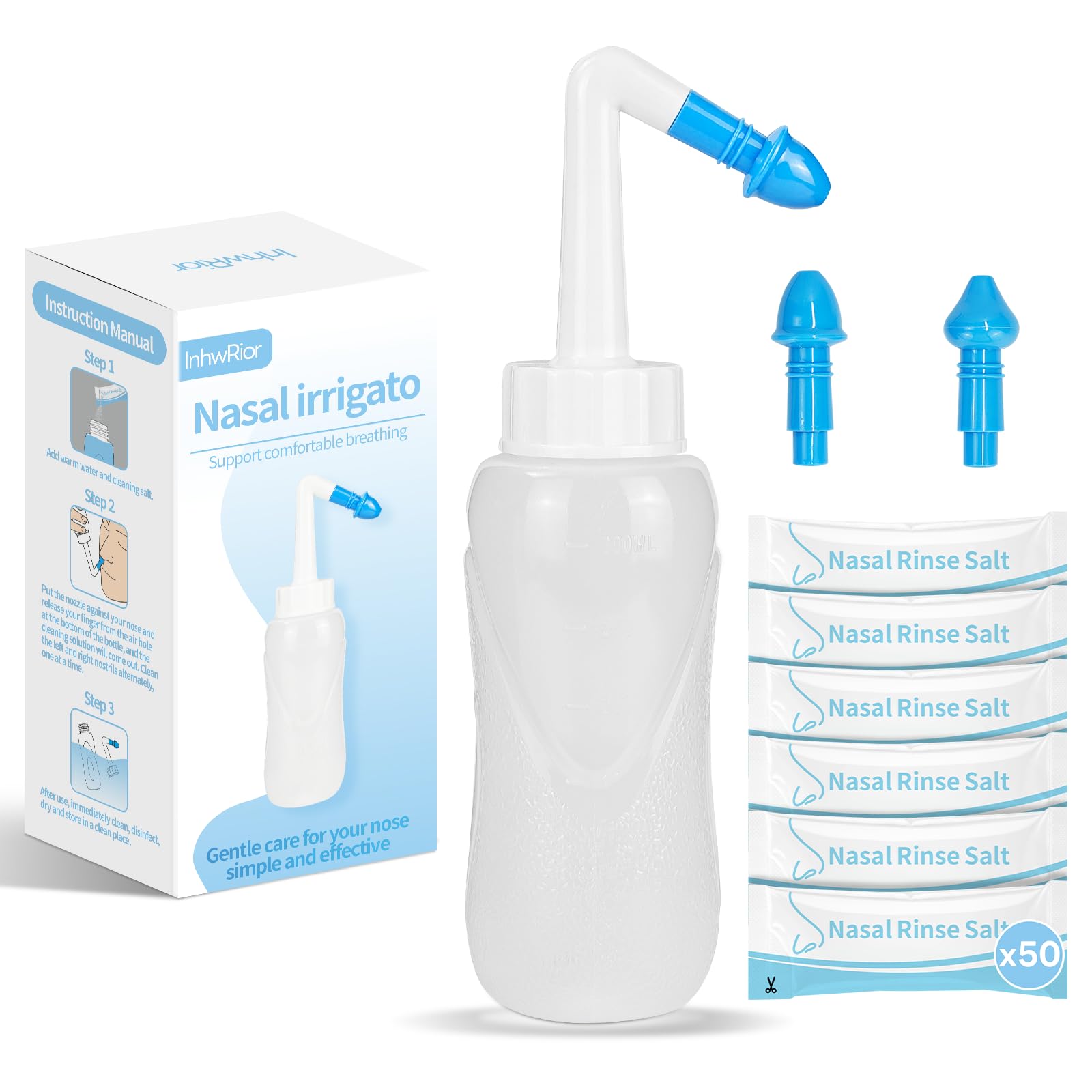 InhwRior Nasal Irrigation Bottle 300ml Manual Sinus Rinse Kit with 50 Packs Powder (2.7g/300ml) 2 Nozzles Easy to Use Gentle and No Burning