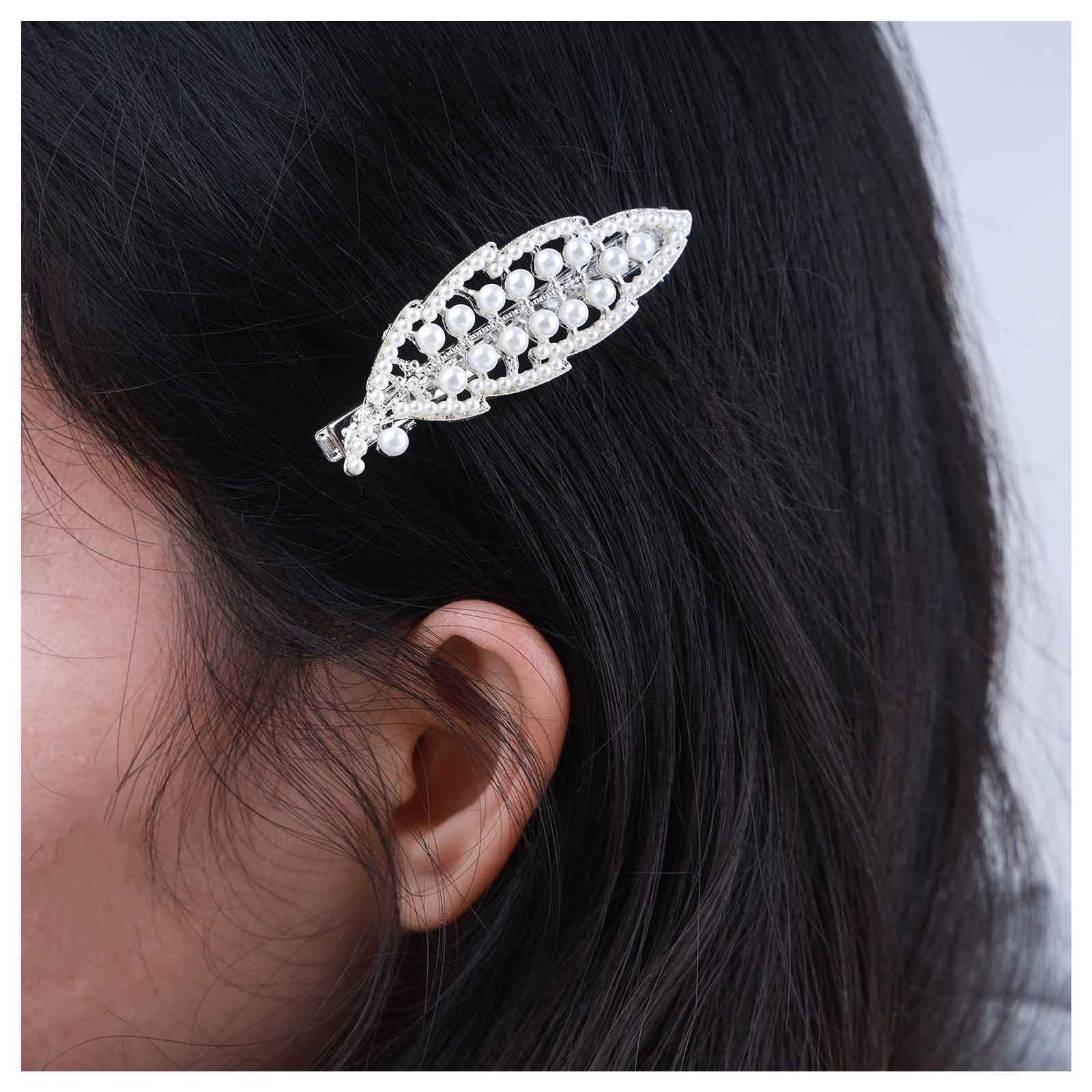 Inilbran Boho Pearl Hair Clip Barrette Silver Leaf Hair Barrette Clip Vintage Pearl Leaf Hairpin Clip French Pearl Bridal Headpieces Decorative Headwear Hair Accessories for Women and Girls
