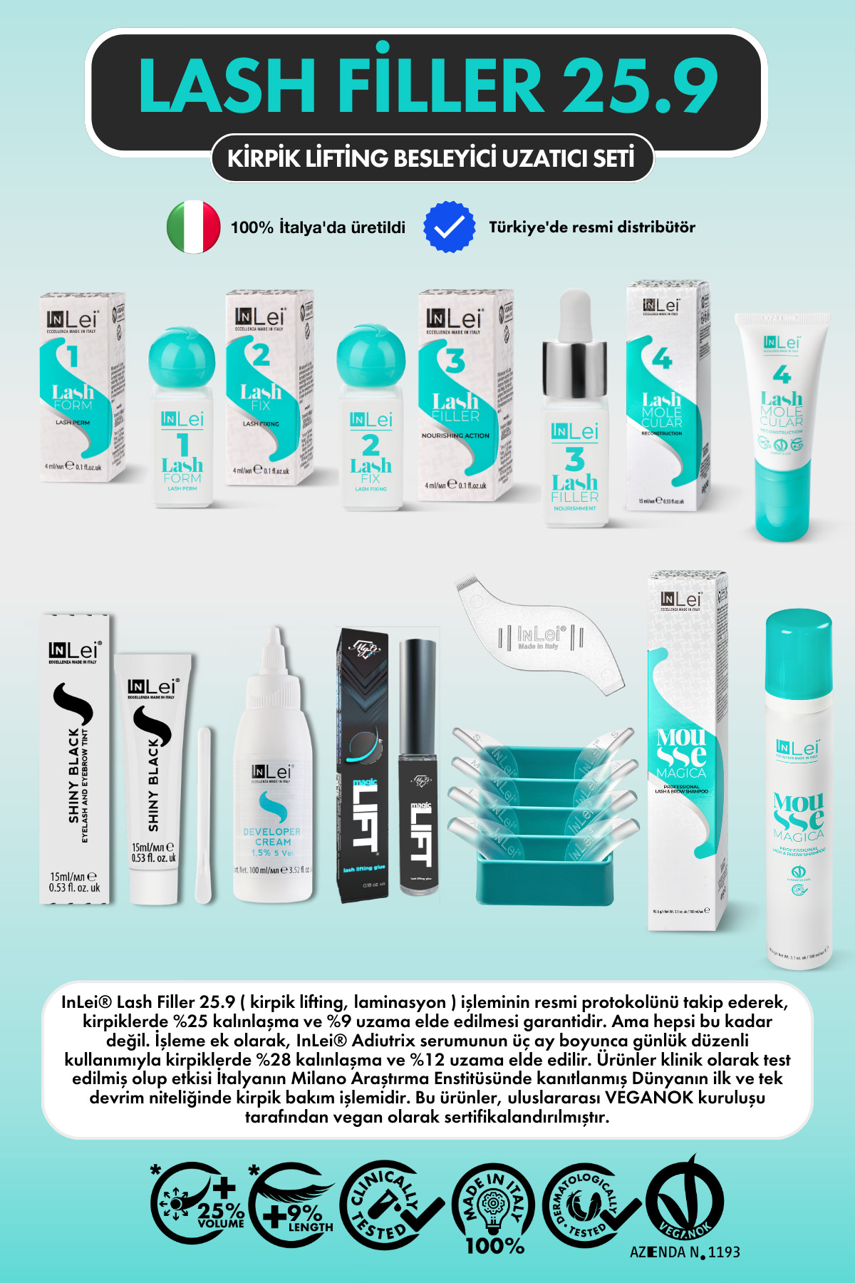InLei Lash Filler 25.9 kirpiklerin hem estetik olarak kivrilmasi ve boyanmasi hem de yapisal olarak kalinlastirma ve 9 uzatma saglayan gelismis bir profesyonel kirpik lifting dolgu islemidir. Sonuçlar, InLei Lash Filler 25.9'un resmi çalisma protokolüne göre elde edilir ve etkinlik testleri ile klinik olarak kanitlanmistir. Bu islemin fonksiyonel maddeleri kirpikleri derinlemesine besler, dis yüzeyini güçlendirir ve ipeksi bir görünüm kazandirir. Ürünler vegan sertifikaya sahiptir. InLei Lash FIller ürünleri klinik olarak test edilmis olup etkisi Italyanin Milano Arastirma Enstitüsünde kanitlanmis dünyanin ilk ve tek devrim niteliginde kirpik bakim islemidir.