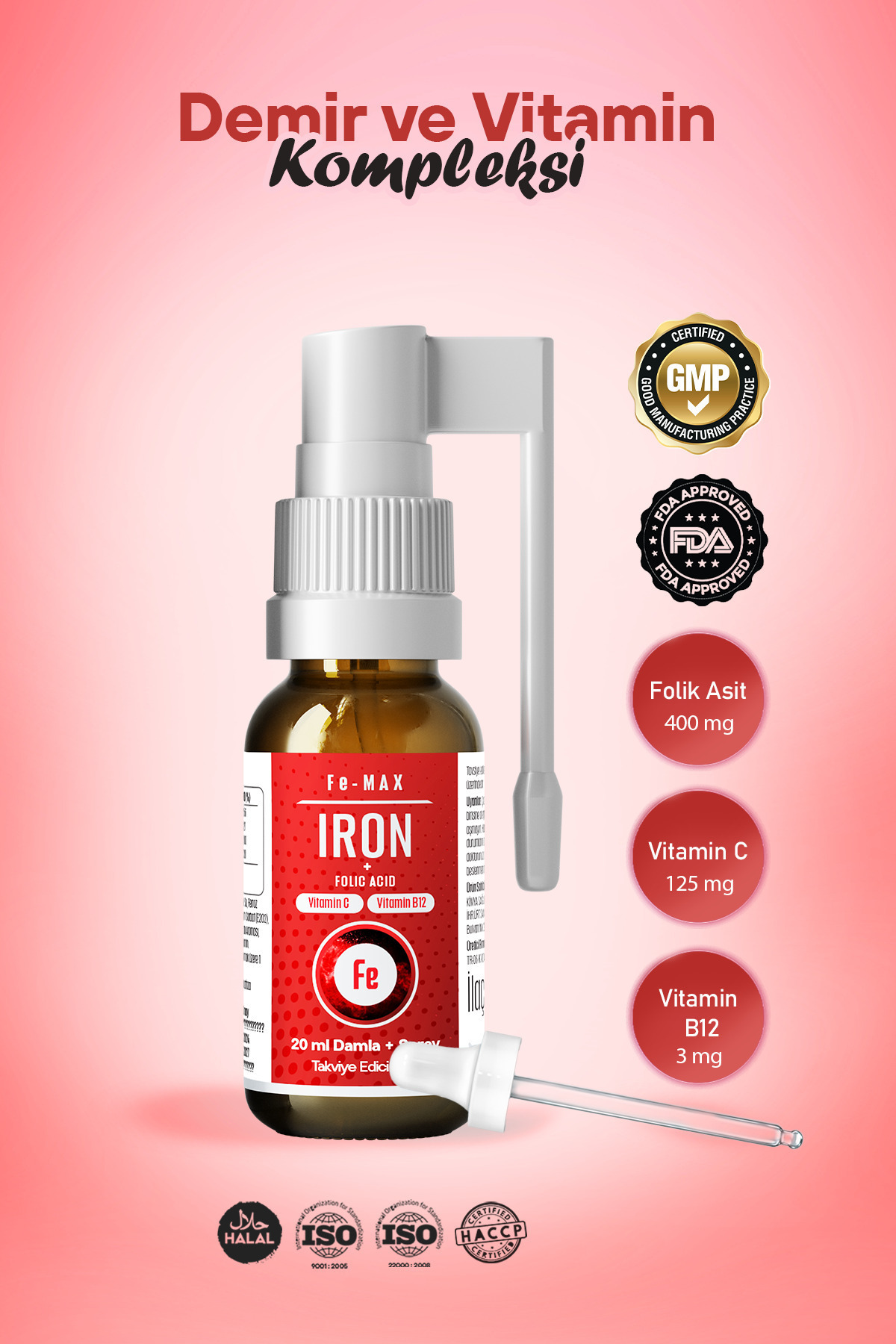 FE-Max stands out with its 17 mg iron content. Its formulation also includes vitamin C, vitamin B12, and folic acid. FE-Max, available in Fe Folic Acid Spray and Drop forms, offers ease of use for individuals who have difficulty swallowing tablets or capsules. The spray and drops provide practical and hygienic use. Its ingredients are manufactured in accordance with international quality standards.