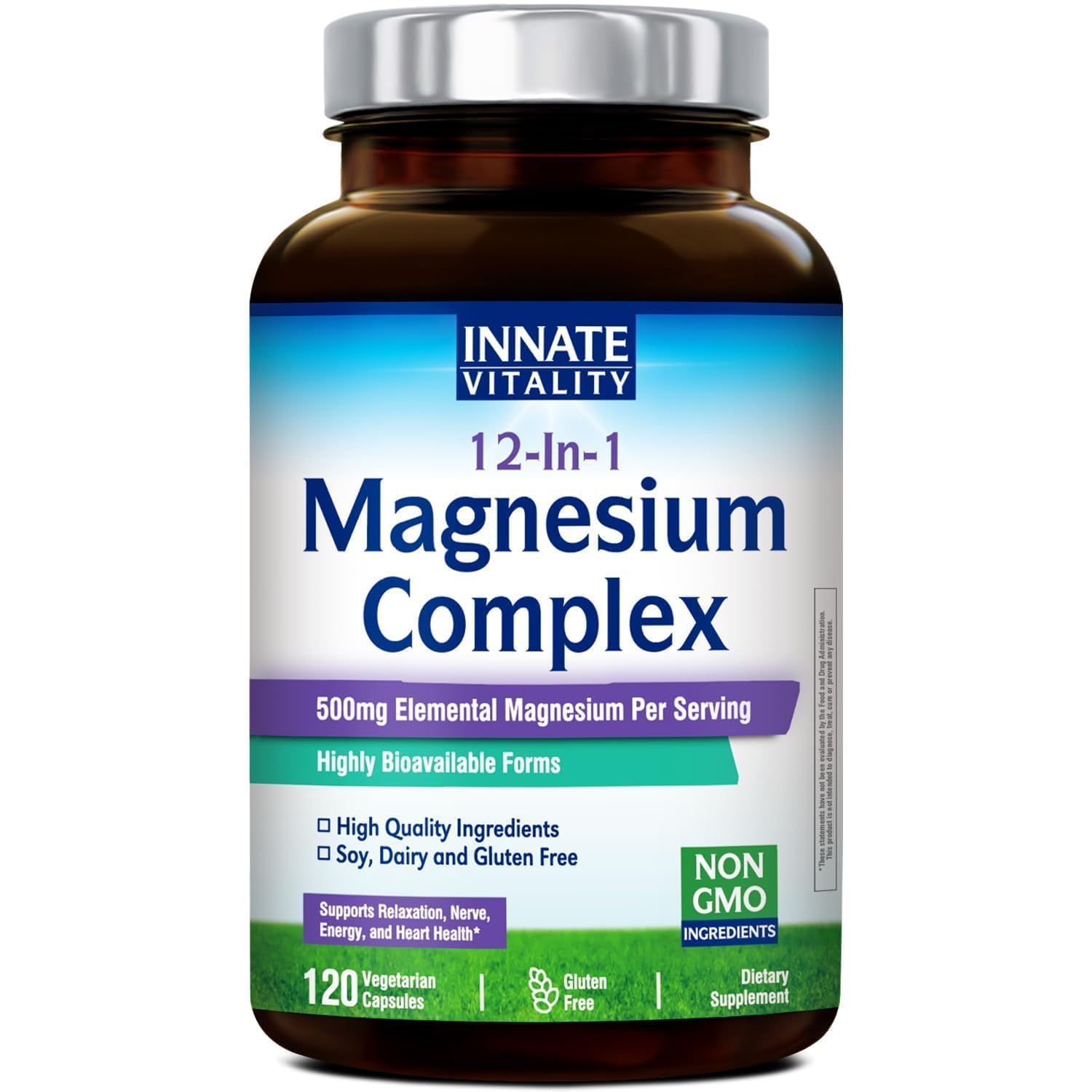 Innate Vitality 12-in-1 Magnesium Complex 500 mg Elemental Mag with Magnesium Glycinate Malate Taurate Aspartate & More Non-GMO for Nerves Sleep Heart Energy 120 Veg Caps