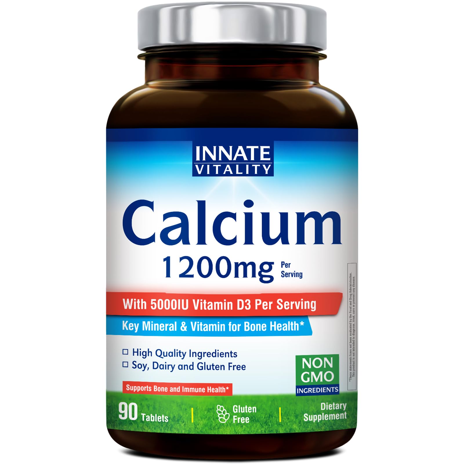 Innate Vitality Calcium 1200 mg with Vitamin D3 5000IU Vitamin D3 Absorbable Calcium Supplement Non GMO No Gluten for Bone Immunity 90 Tablets