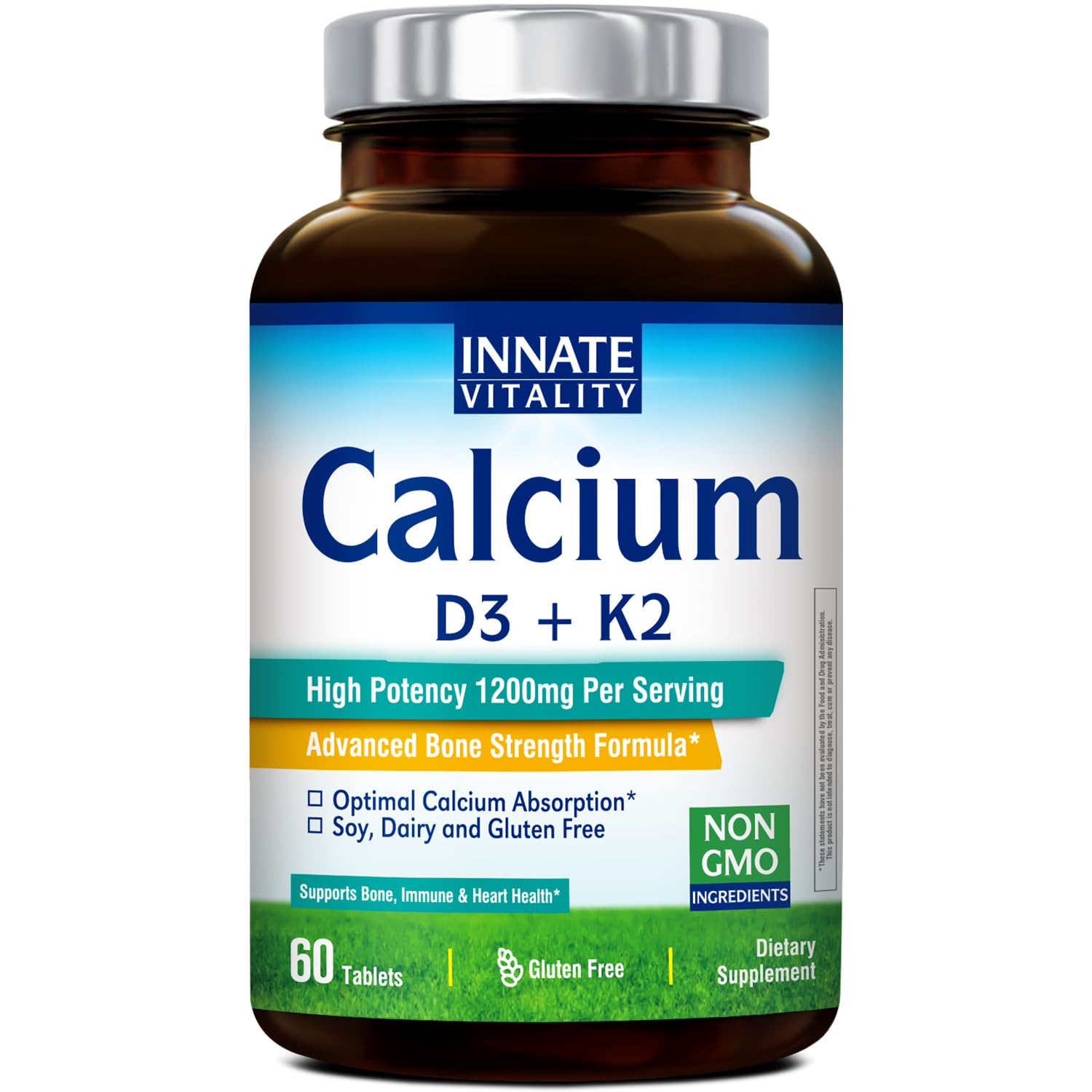 Innate Vitality Calcium Supplement, 1200 mg High Potency with 5000 IU Vitamin D3 & K2 MK7, Enhanced Absorption, for Bone Density, Strength & Immunity, Non-GMO, Easy to Swallow, 60 Tablets