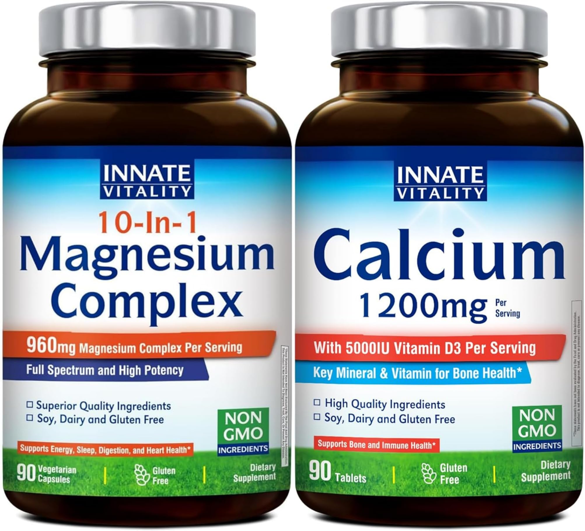 Innate Vitality Magnesium Calcium with D3 Bundle – Daily Support for Bone, Energy, Nerve Function Relaxation – For Active Lifestyles, Aging Needs Women's Wellness – 90 Count Each