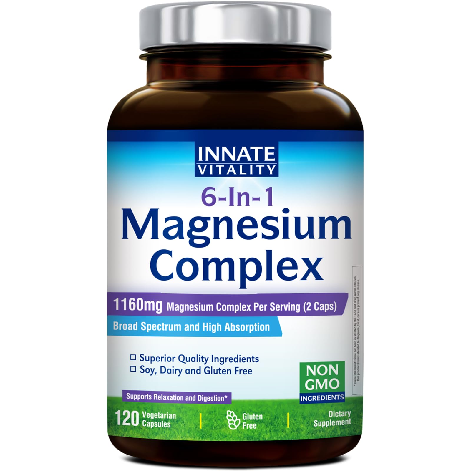 [Crafted for Superior Results] When it comes to your health and overall well-being, we don't take any chances. We strive to deliver premium products for you. From ingredient sourcing to product manufacturing, every step meets rigorous standards. [Proudly Made in the USA] Our 6-In-1 Magnesium Complex is made with the highest grade ingredients in our GMP certified facility right here in the USA and is always third-party tested for purity and potency. By using the latest US technologies, our products offer highest potency and freshness of the whole foods nutrition the best way nature intended. [Relaxation Digestion ] When we're stressed out, our gut knows it. Magnesium Complex is designed to Reset Refresh your body, working in harmony with your nerve system to ease tension that may cause stomach upsets. Our advanced formula also includes Magnesium Carbonate Citrate to neutralize stomach acid, relieve minor constipation, and promote regular bowel movements. Calm nervous butterflies in your stomach with Innate Vitality Magnesium Complex. . [Highly Absorbable Magnesium Complex] Our unique blend of 6 different types of magnesium - magnesium carbonate, citrate, glycinate, lactate, aspartate gluconate - creates a synchronized dance of benefits to support relaxation, bone health, and regularity. Each two-capsule serving delivers 260mg of elemental magnesium, 62 of the recommended daily value. If you don't get adequate daily magnesium intake from diet alone, this is an excellent choice. . [100 Natural, Safe, Vegetarian-Friendly Ingredients] Innate Vitality 6-In-1 Magnesium Complex is soy-free, gluten-free, dairy-free, Non-GMO vegetarian, with no corn, no eggs, no wheat, no tree nuts, no peanuts, no fish shellfish, no cholesterol, no artificial colors or flavors. Our ingredients are also Kosher and Halal.