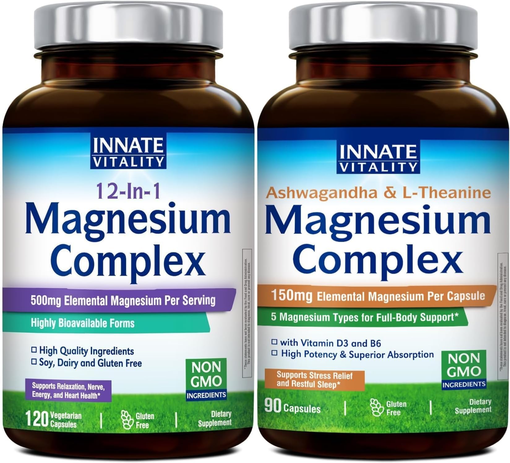 Innate Vitality Magnesium Complex Bundle 12-in-1 Magnesium (500mg Elemental) + Magnesium with Ashwagandha L-Theanine Vitamin D3 & B6 Full Spectrum Support for Sleep Stress Nerves Heart & Bones