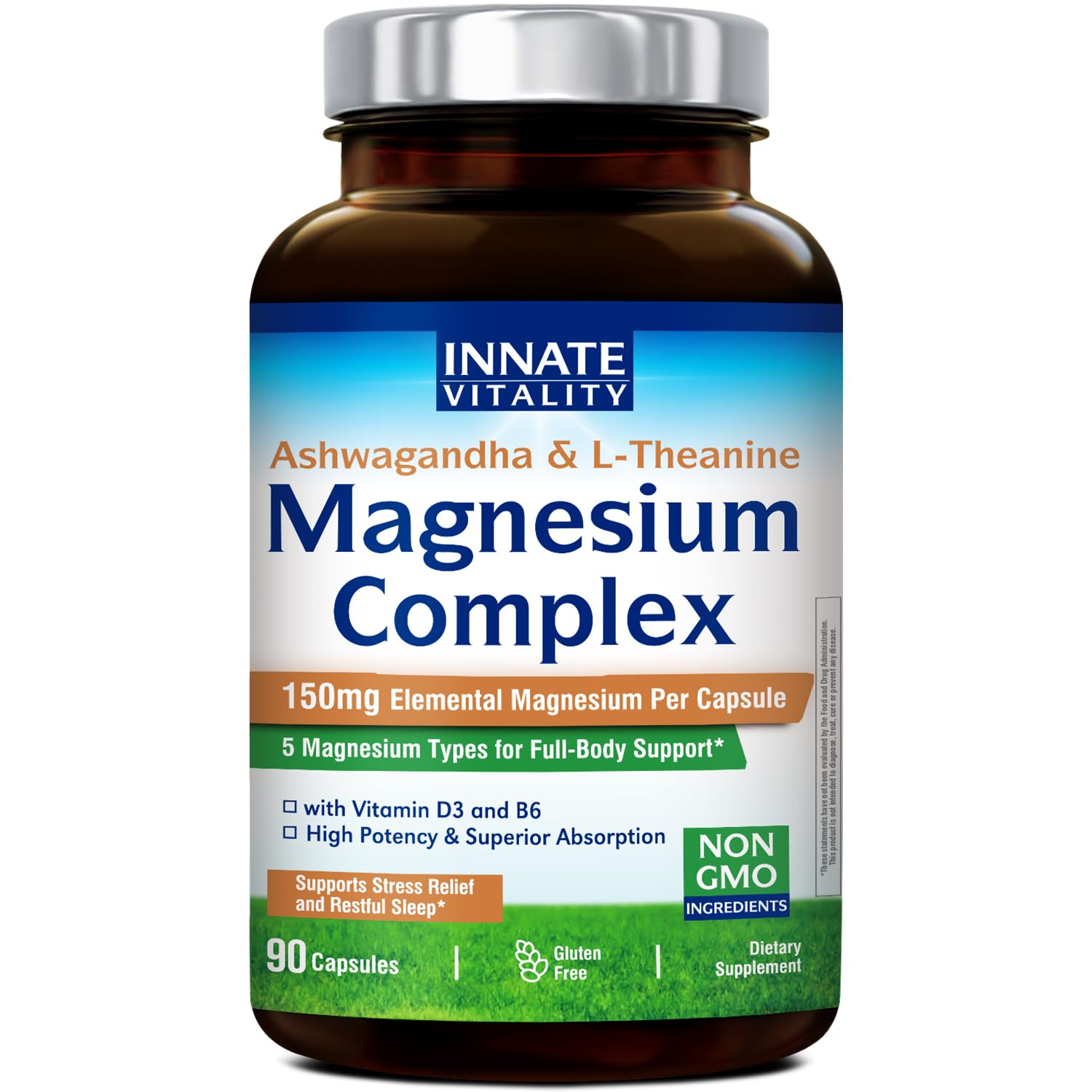 Innate Vitality Magnesium Complex, Magnesium Glycinate Citrate Malate Taurate with Ashwagandha L-Theanine Vitamin D3 & B6, High Absorption, Full Spectrum, Bones Stress Sleep Support, 90 caps