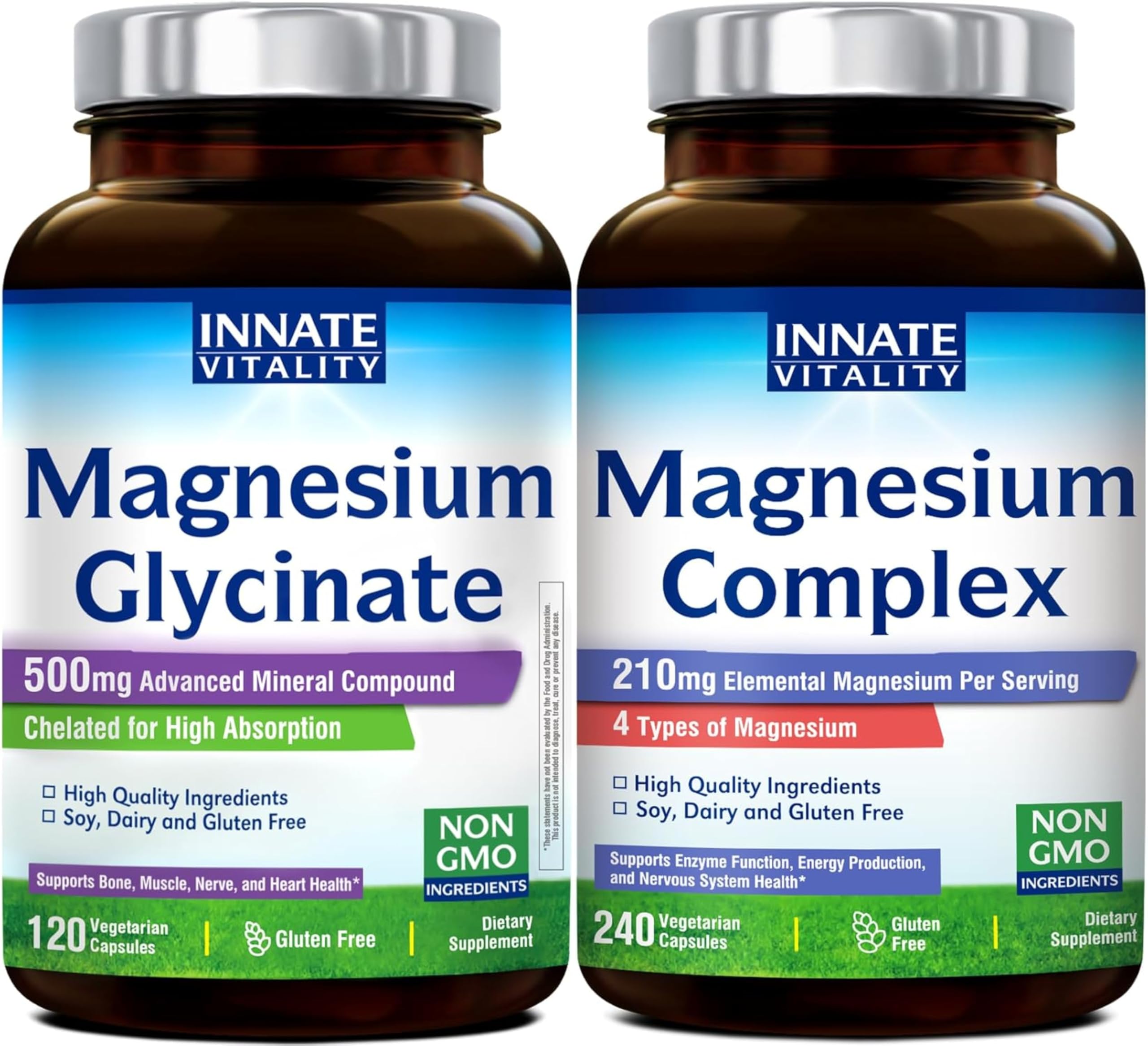 [100 Natural, Vegetarian-Friendly and the Most Bioavailable Form of Magnesium Supplement] All Innate Vitality Magnesium Glycinate products are soy-free, gluten-free, dairy-free, Non-GMO vegetarian, with no corn, no eggs, no wheat, no tree nuts, no peanuts, no fish, no shellfish, no artificial colors, flavors, binders or fillers. Our ingredients are also Kosher and Halal certified.[Proudly Made in the USA] Innate Vitality Magnesium Complex is made in our GMP certified facility right here in the USA and is always third-party tested for purity and potency soy-free, gluten-free, dairy-free, Non-GMO vegetarian, with no corn, no eggs, no wheat, no tree nuts, no peanuts, no fish, no shellfish, no artificial colors or flavors. [Broad-Spectrum Benefits ] Whether you're looking to boost energy production and reduce fatigue, promote calmness and relaxation, strengthen muscle and bone health, or support healthy digestion and regular bowel movements, Innate Vitality magnesium complex supplement has you covered. . [4-in-1 Magnesium Complex] Innate Vitality Magnesium Complex is composed of 4 different types of magnesium - magnesium glycinate, magnesium malate, magnesium citrate, and magnesium oxide, delivering 210mg of elemental magnesium per serving. It is designed to provide comprehensive support for your body and help you feel your best. . [High Absorption Magnesium Glycinate Supplement for Support Nerve Muscle Health ] Magnesium is an essential mineral used by every organ in your body. It also plays a key role in regulating the body's normal stress-response system and promote muscle health. . [70mg Elemental Magnesium From 500mg Magnesium Glycinate] Innate Vitality non-buffered formula contains 500mg of magnesium glycinate per capsule, and delivers 70mg of elemental magnesium each capsule. Magnesium Glycinate is also known as magnesium bisglycinate, which is chelated to optimize bioavailability and is the easiest form for the body to absorb.