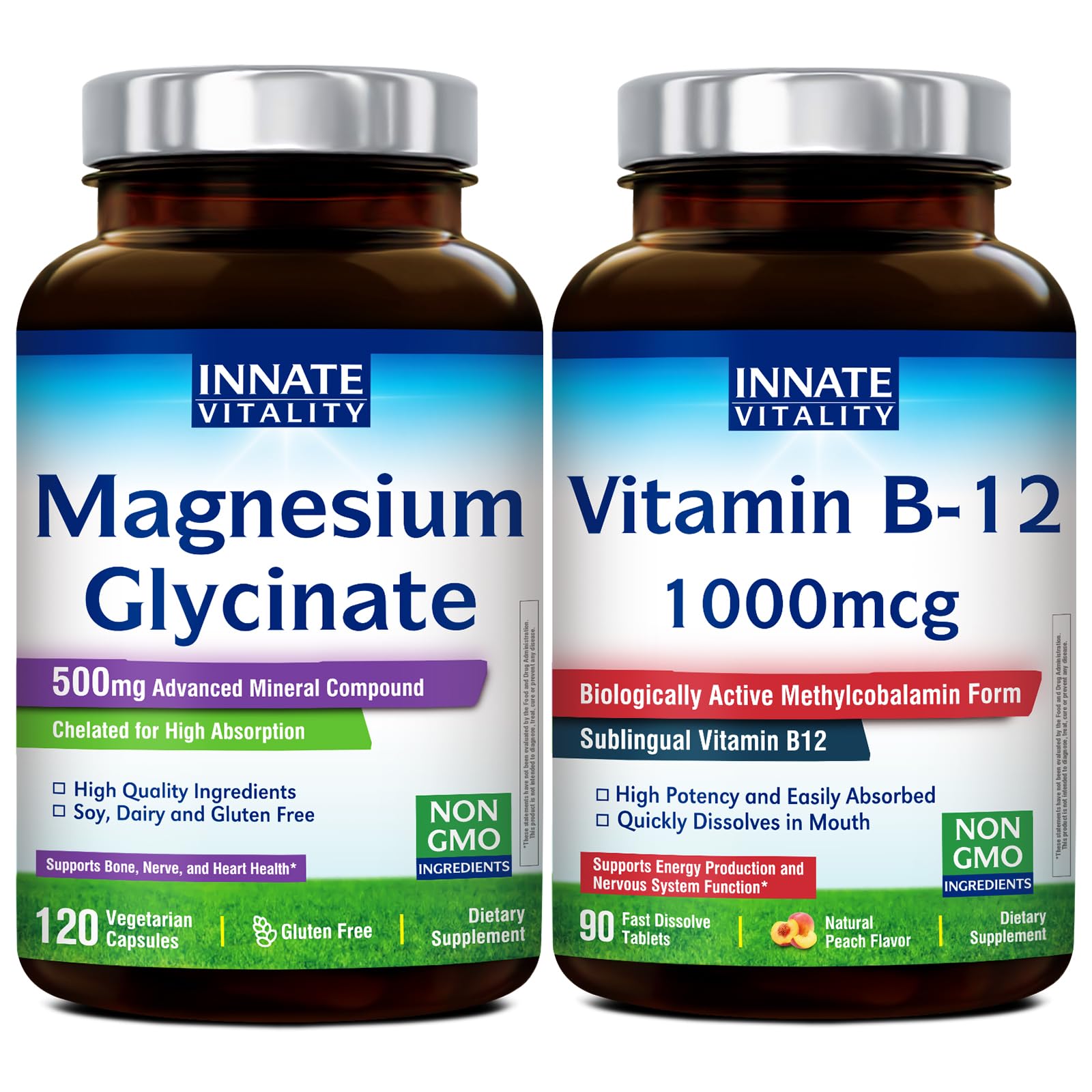 Innate Vitality Magnesium Glycinate Features: Doctor Formulated for Max Benefits 500mg Magnesium Glycinate per Capsule 70mg Elemental Magnesium per Capsule 100 Chelated, Superior Absorption and Better Toleration Non-GMO, Vegan and Vegetarian Friendly Gluten, Dairy and Soy Free Taking Innate Vitality Magnesium Glycinate every day helps: Promote muscle nerve health Support heart function Support overall health nutrient metabolism Innate Vitality Vitamin B-12 Features: Max Strength 1000mcg Methylcobalamin Bioactive and Body-Ready Form of Vitamin B12 Fast Dissolve Tablets and Rapid Absorption Natural Peach Flavor and Great Tasting Easy to Take and No Water Necessary Non-GMO, Vegan and Vegetarian Friendly Gluten, Dairy and Soy Free Taking Innate Vitality Vitamin B-12 every day helps: Convert food into cellular energy Boost energy levels Maintain nervous system health Support brain function Support concentration memory Promote red blood cell production Potency and Purity Our products have undergone examination by independent 3rd party labs based in the USA. Does not contain artificial colors, flavors, sweeteners, or preservatives. Free of gluten, dairy, eggs, soy, wheat, fish, shellfish, tree nuts and peanuts. Made in the USA Proudly made in a GMP Certified Facility in the USA.[For Most Lifestyles] Innate Vitality Magnesium Glycinate and Vitamin B-12 supplements are made with the highest grade ingredients in a GMP certified facility in the USA. They are Non-GMO Vegetarian, free of gluten, wheat, soy, dairy, eggs, tree nuts, peanuts, fish and shellfish. No artificial colors or flavors. [Boost Your Energy Vitality ] As an essential nutrient, vitamin B12 plays a vital role in various bodily functions, including energy metabolism, brain health, nerve function, and red blood cell production. It assists in the conversion of food into energy, provides you with a natural energy boost, and improves your concentration, memory, and overall mental clarity, making it easier to tackle your busy day. . [Max Strength Rapid Absorption] One small fast dissolve tablet is packed with a high potency 1000mcg dose of bioactive vegan B12 in the form of methylcobalamin that requires no conversion. It can quickly melt in the mouth and be rapidly absorbed into the blood stream, ensuring efficient utilization by your body. Simply place a tablet on your tongue and let it dissolve, savoring the delightful peach flavor while feeling more energized throughout the day. . [Support Nerve, Heart Muscle Health ] Magnesium is an essential mineral used by every organ in your body. It also plays a key role in regulating the body's normal stress-response system and promote heart muscle health. . [The Most Bioavailable Form of Magnesium] Our vegetarian formula contains 500mg of magnesium glycinate (also known as magnesium bisglycinate) per capsule, which is the easiest form of magnesium for the body to absorb. The elemental form of magnesium is chelated to optimize bioavailability. And each capsule delivers 70mg of elemental magnesium.