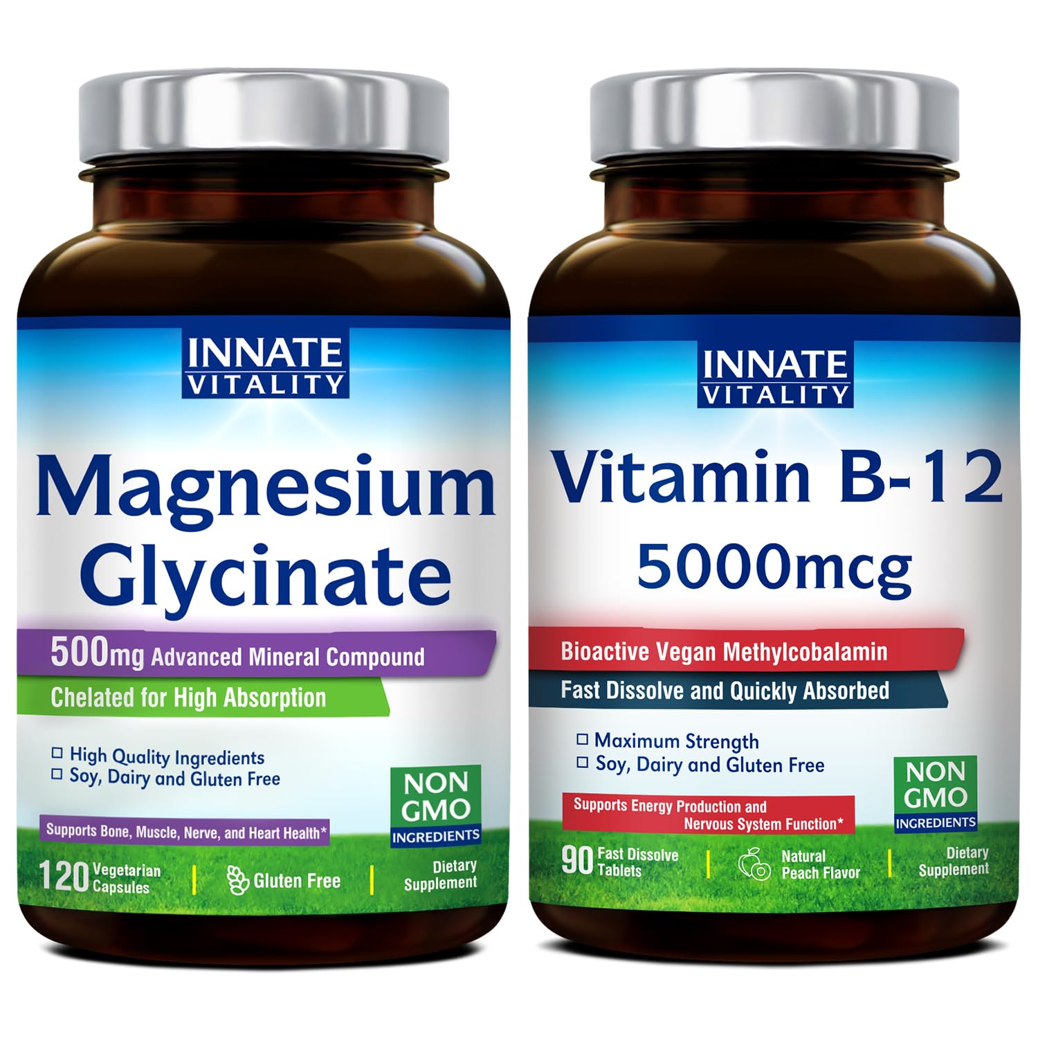 Innate Vitality Magnesium Glycinate Features: Doctor Formulated for Max Benefits 500mg Magnesium Glycinate per Capsule 70mg Elemental Magnesium per Capsule 100 Chelated, Superior Absorption and Better Toleration Non-GMO, Vegan and Vegetarian Friendly Gluten, Dairy and Soy Free Taking Innate Vitality Magnesium Glycinate every day helps: Promote muscle nerve health Support heart function Support overall health nutrient metabolism Innate Vitality Vitamin B-12 Features: Max Strength 5000mcg Methylcobalamin Bioactive and Body-Ready Form of Vitamin B12 Fast Dissolve Tablets and Rapid Absorption Natural Peach Flavor and Great Tasting Easy to Take and No Water Necessary Non-GMO, Vegan and Vegetarian Friendly Gluten, Dairy and Soy Free Taking Innate Vitality Vitamin B-12 every day helps: Convert food into cellular energy Boost energy levels Maintain nervous system health Support brain function Support concentration memory Promote red blood cell production Potency and Purity Our products have undergone examination by independent 3rd party labs based in the USA. Does not contain artificial colors, flavors, sweeteners, or preservatives. Free of gluten, dairy, eggs, soy, wheat, fish, shellfish, tree nuts and peanuts. Made in the USA Proudly made in a GMP Certified Facility in the USA.[For Most Lifestyles] Innate Vitality Magnesium Glycinate and Vitamin B-12 supplements are made with the highest grade ingredients in a GMP certified facility in the USA. They are Non-GMO Vegetarian, free of gluten, wheat, soy, dairy, eggs, tree nuts, peanuts, fish and shellfish. No artificial colors or flavors. [Boost Your Energy Vitality ] As an essential nutrient, vitamin B12 plays a vital role in various bodily functions, including energy metabolism, brain health, nerve function, and red blood cell production. It assists in the conversion of food into energy, provides you with a natural energy boost, and improves your concentration, memory, and overall mental clarity, making it easier to tackle your busy day. . [Max Strength Rapid Absorption] One small fast dissolve tablet is packed with a high potency 5000mcg dose of bioactive vegan B12 in the form of methylcobalamin that requires no conversion. It can quickly melt in the mouth and be rapidly absorbed into the blood stream, ensuring efficient utilization by your body. Simply place a tablet on your tongue and let it dissolve, savoring the delightful peach flavor while feeling more energized throughout the day. . [Support Nerve, Heart Muscle Health ] Magnesium is an essential mineral used by every organ in your body. It also plays a key role in regulating the body's normal stress-response system and promote heart muscle health. . [The Most Bioavailable Form of Magnesium] Our vegetarian formula contains 500mg of magnesium glycinate (also known as magnesium bisglycinate) per capsule, which is the easiest form of magnesium for the body to absorb. The elemental form of magnesium is chelated to optimize bioavailability. And each capsule delivers 70mg of elemental magnesium.