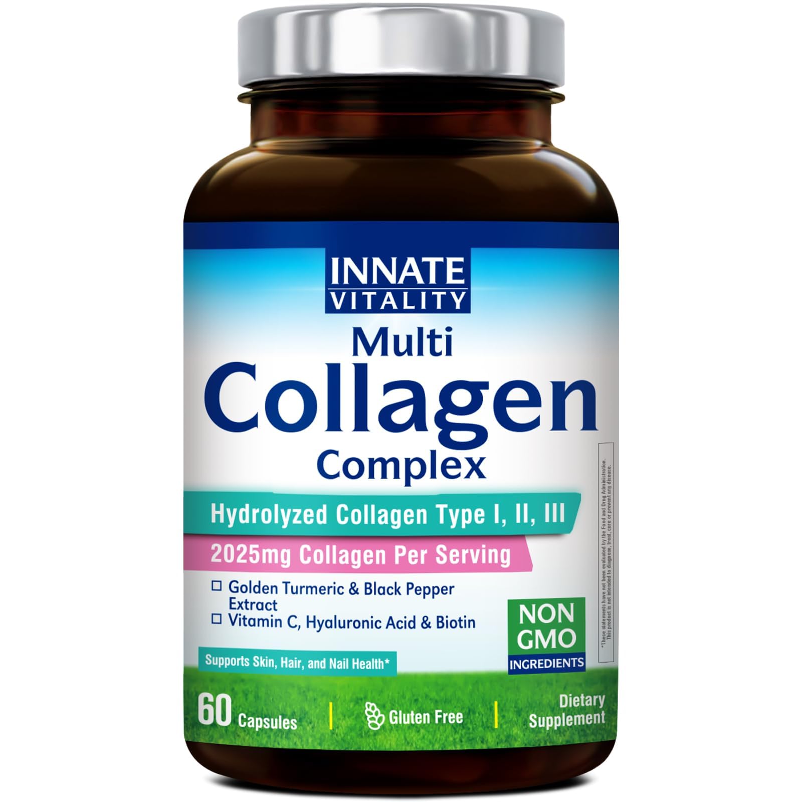 [Crafted for Superior Results] When it comes to your health and overall well-being, we don't take any chances. We strive to deliver premium products for you. From ingredient sourcing to product manufacturing, every step meets rigorous standards. [Proudly Made in the USA] Our Multi Collagen Complex is made with the highest grade ingredients in our GMP certified facility right here in the USA and is always third-party tested for purity and potency. By using the latest US technologies, our products offer highest potency and freshness of the whole foods nutrition the best way nature intended. [Rejuvenate Beauty Vitality ] These age-defying must-haves work together to help nourish and protect your skin, hair, nails and every cell underneath. They also give bone strength flexibility and provide the amino acids needed for a healthy gut. Enhanced with black pepper extract for unparalleled bioavailability, our hydrolyzed collagen capsules can be digested and absorbed quickly for maximum benefits. . [All in One Super Collagen Capsules] Looking for the fountain of youth? Innate Vitality Multi Collagen Complex is the one-stop shop for all your beauty needs. It contains an all-star lineup of the best anti-aging ingredients: type I, II III collagen peptides, antioxidant vitamin C, dew-inducing hyaluronic acid, hair-loving biotin and superfood turmeric. . [100 Natural, Safe, Hormone-Free Ingredients] Innate Vitality Multi Collagen Complex uses grass-fed bovine, wild-caught fish free-range chicken with no growth hormones. It is soy-free, gluten-free, dairy-free, Non-GMO, with no corn, no eggs, no wheat, no tree nuts, no peanuts, no shellfish, no cholesterol, no artificial colors or flavors. Our ingredients are also Kosher and Halal.