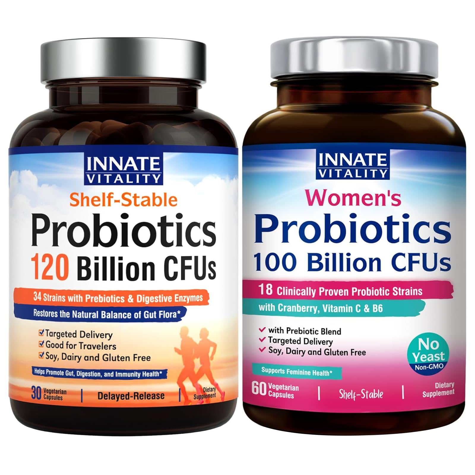 Innate Vitality Premium Probiotics Bundle - 100 Billion 120 Billion CFUs, Complete Digestive Support with Prebiotics, Cranberry, Vitamins C B6, Immune Health, Non-Refrigerated, 90 Total Capsules[Crafted for Superior Results] When it comes to your health and overall well-being, we don't take any chances. We strive to deliver premium products for you. From ingredient sourcing to product manufacturing, every step meets rigorous standards. [Proudly Made in the USA] All Innate Vitality Probiotics are made in our GMP certified facility right here in the USA. They are soy-free, gluten-free, dairy-free, Non-GMO vegetarian, with no corn, no eggs, no wheat, no tree nuts, no peanuts, no fish shellfish, no cholesterol, no artificial colors, flavors, binders or fillers. [Delayed-Release and Shelf-Stable] Protected in delayed-release capsules, these vaginal digestive probiotics are able to survive the stomach's acidity and reach the intestines intact where they exert their beneficial effects. Thanks to the shelf-stable technology, they remain viable regardless of refrigeration, making it perfect for both at-home and on-the-go use. [Get Your Hormones Balanced ] At the mercy of your crazy hormones? Experiencing a lot of complex emotional thoughts and feelings? Innate Vitality Women's Probiotics is here to help. While promoting the balance of good cultures in your gut ecosystem, our probiotics also delivers bioactive vitamin B6 (pyridoxal-5-phosphate) to support women's special health needs, helping you balance hormone levels and reduce mood swings and irritability. . [3-Way Digestive Support] Our clinically proven strains are enhanced with organic prebiotic fibers that help feed probiotics and encourage them to grow, as well as 13 types of naturally sourced digestive enzymes that help break down hard-to-digest foods and boost nutrient uptake. .