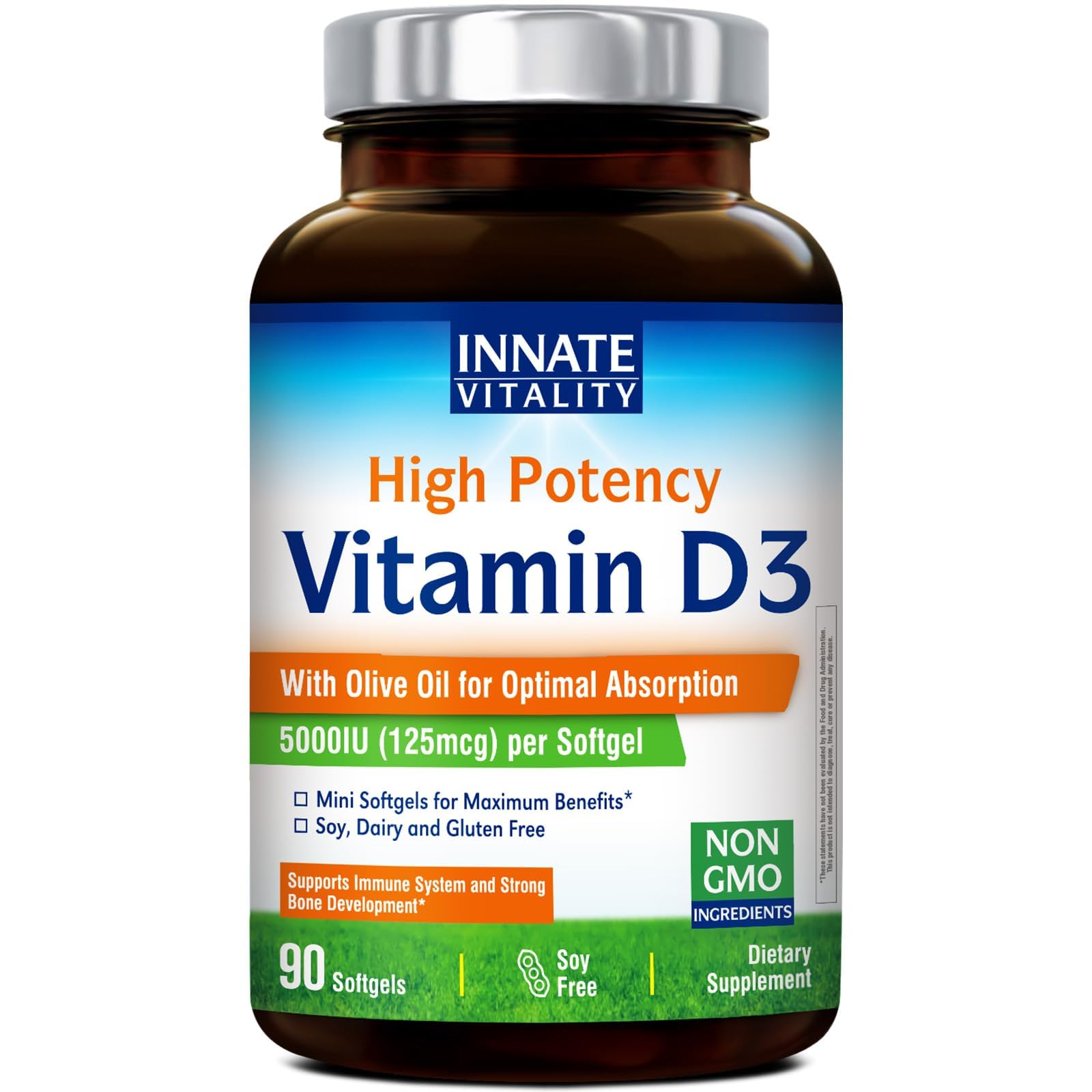 [Crafted for Superior Results] When it comes to your health and overall well-being, we don't take any chances. We strive to deliver premium products for you. From ingredient sourcing to product manufacturing, every step meets rigorous standards. [Natural Ingredients] Innate Vitamin D3 5000 IU is gluten-free, dairy-free, Non-GMO, with no corn, no eggs, no wheat, no tree nuts, no peanuts, no fish shellfish, no cholesterol, no artificial colors, flavors, binders or fillers. [Supports Bone, Immune Teeth Health ] Our Vitamin D3 promotes calcium and phosphorus absorption to maintain strong bones and teeth. It also helps support immune function, heart health, and overall mood — keeping you active, balanced, and thriving every day. . [Enhanced Absorption with Cold-Pressed Olive Oil] Because vitamin D is fat-soluble, we've paired it with premium cold-pressed olive oil to maximize absorption and effectiveness. Each softgel ensures your body can fully utilize this essential micronutrient for optimal results. . [Maximum Strength Vitamin D] Innate Vitality Vitamin D3 supplement delivers a highly bioavailable form of vitamin D3, giving you your daily dose of sunshine without the dangers of UVB exposure. Whether it's cloudy or bright, you're covered with reliable support for year-round wellness. .