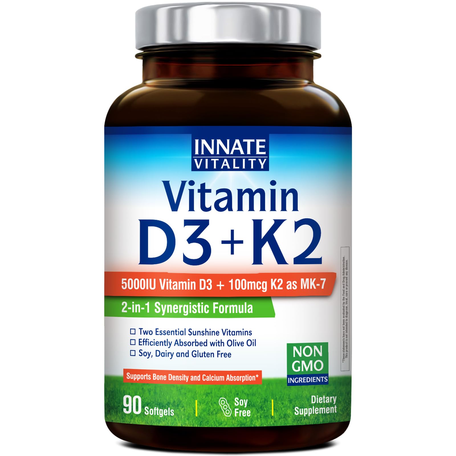 [Crafted for Superior Results] When it comes to your health and overall well-being, we don't take any chances. We strive to deliver premium products for you. From ingredient sourcing to product manufacturing, every step meets rigorous standards. [Natural Ingredients] Innate Vitality k2 d3 vitamin supplement is gluten-free, dairy-free, Non-GMO, with no corn, no eggs, no wheat, no tree nuts, no peanuts, no fish shellfish, no cholesterol, no artificial colors, flavors, binders or fillers. [Supports Bone, Immune Teeth Health ] Innate Vitality Vitamin D3 and K2 supplements promote calcium and phosphorus absorption to maintain strong bones and teeth. It also helps support immune function, heart health, and overall mood — keeping you active, balanced, and thriving every day. . [Enhanced Absorption with Cold-Pressed Olive Oil] Fat-soluble vitamins like vitamins D3 K2 pair best with fats for better absorption. We've added premium cold-pressed olive oil to maximize absorption and effectiveness. Each softgel ensures your body can fully utilize these essential micronutrients for optimal results. . [Sunshine Vitamin D3 Meets Superior K2] Innate Vitality use natural vitamin D3 5000 iu - the same form your body makes from sunlight - to deliver all the benefits of sunshine without UV exposure. Our vitamin K2 (as MK-7) is the most bioactive form, known for its excellent stability and long-lasting support for calcium utilization, bone growth, and heart health. .