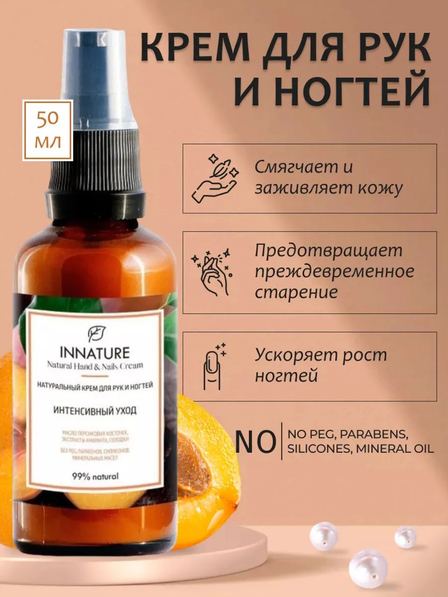 Крем для рук и ногтей интенсивный уход INNATURE - это косметическое средство для ухода за кожей рук. Он увлажняет и питает, смягчает и защищает кожу, делая ее здоровой, молодой и красивой. Крем содержит экстракты амаранта и солодки, граната и бамбука, а также масло персиковых косточек, которые интенсивно увлажняют и питают кожу рук, делая ее мягкой, гладкой и увлажненной. Он также укрепляет ногтевую пластину и стимулирует рост здоровых ногтей. Экстракты родиолы и семян граната обладают антиоксидантными свойствами, которые помогают защитить кожу от негативного воздействия свободных радикалов и ускоряют процесс регенерации клеток. Протеины пшеницы и гидролизованный кератин укрепляют ногтевую пластину, предотвращая ее ломкость и отслоение. Крем также содержит провитамин В5 и витамин F, витамин E и глицерилмоностеарат, которые помогают улучшить эластичность кожи, сохранить ее упругость и уменьшить признаки старения, такие как морщины и потеря упругости. Средство имеет легкую текстуру, которая быстро впитывается и не оставляет ощущение липкости, что делает его удобным для ежедневного использования. Крем укрепляет ногти, защищает кожу от окружающей среды и подходит для использования женщинами и мужчинами. Упаковка с дозатором и его маленький объем - 50 мл делает продукт удобным для использования и переноски везде. Крем не содержит сульфатов, парабенов, силиконов и минеральных масел, а также не тестируется на животных. Косметические продукты INNATURE являются растительными средствами для восстановления естественных защитных функций кожи и волос. Органическая косметика отлично подойдет в качестве подарка для женщин и мужчин на различные праздники. Уходовое средство для рук подходит для подарков на день рождения и 8 марта, день матери и новый год.