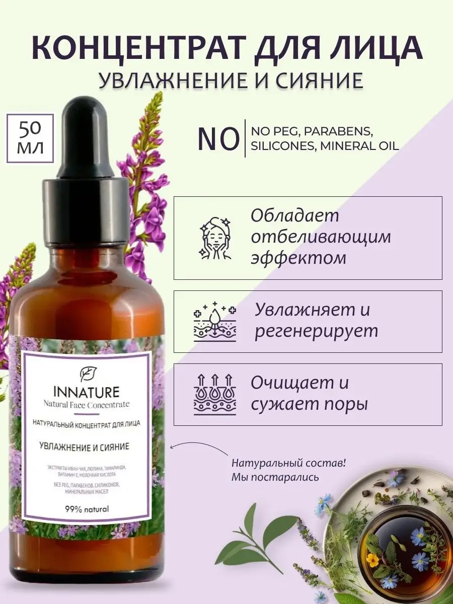 Сыворотка для лица увлажняющая INNATURE, 50 мл - это концентрированное средство для ухода за кожей, которое обеспечивает комплексный уход за кожей, увлажняет, питает, успокаивает и омолаживает ее. Увлажняющая сыворотка предназначена для борьбы с признаками старения кожи, такими как морщины, потеря упругости и сухость. Она также уменьшает появление пигментных пятен, сужает поры и улучшает цвет лица. Сыворотка для лица от морщин может быть использована как самостоятельный продукт или в качестве основы для крема или маски. Средство обладает легкой текстурой и быстро впитывается, не оставляя жирной пленки на коже. Экстракт иван чая - обладает противовоспалительными и антиоксидантными свойствами, помогает снимать раздражение и улучшает общее состояние кожи. Экстракт семян люпина стимулирует синтез коллагена и эластина, укрепляет и улучшает упругость кожи. Экстракт семян тамарина увлажняет и смягчает кожу, придает ей гладкость и упругость. Витамин E - сильный антиоксидант, защищает кожу от воздействия свободных радикалов, улучшает ее упругость и эластичность. Д-пантенол (провитамин В5) - успокаивает и увлажняет кожу, улучшает процессы регенерации и заживления. Все эти компоненты вместе образуют концентрат для лица, который увлажняет, питает, успокаивает и восстанавливает кожу, придавая ей здоровый и сияющий вид. Способ применения: Встряхнуть флакон, нанести на очищенную кожу лица, шеи и декольте. Сыворотка для лица не содержит парабенов, силиконом и миниральных масел, что делает ее более натуральным и безопасным для кожи продуктом. Органическая косметика отлично подойдет на подарок жене и маме, подруге и девушке, а также мужчине. Уходовая косметика от INNATURE станет полезным подарком на день рождения и 8 марта, новый год и просто так.