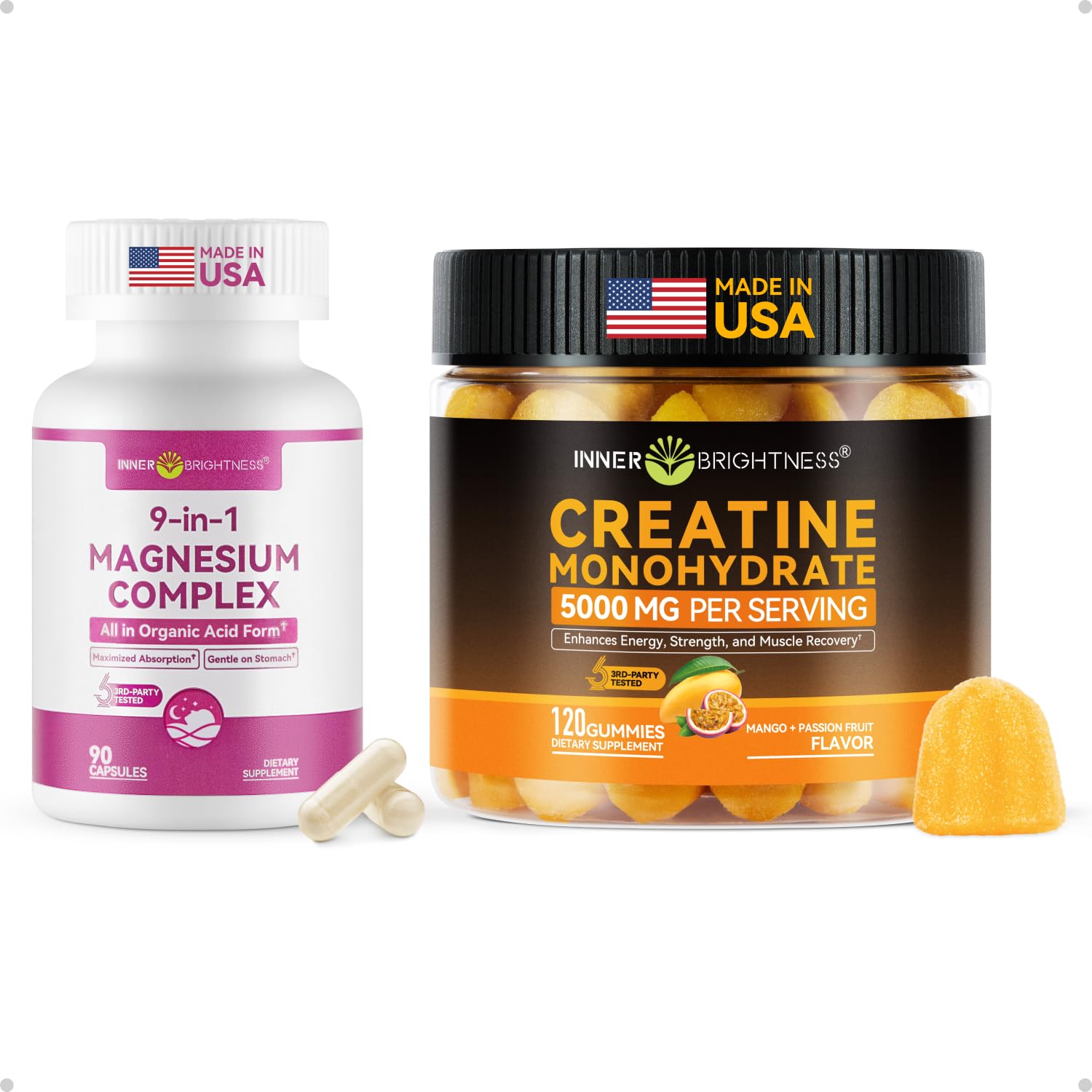 Inner Brightness Creatine Monohydrate Gummies 9-in-1 Magnesium Complex, 300mg Magnesium from 9 Organic FormsHigh Absorption: Made with 100 organic acid magnesium forms, our 9-in-1magnesium supplement dissolves more easily and is absorbed more efficiently than common inorganic options. That means more magnesium gets to where your body needs it—so you feel the benefits, not digestive discomfort. A smarter way to get real magnesium support from every serving. Expertly Selected Organic Magnesium: Not all magnesium is the same. Instead of using cheap inorganic forms like magnesium oxide, we use only nine carefully selected organic magnesium forms, such as glycinate, malate, and citrate, chosen for how the body recognizes and uses them—so you don't have to compare labels or research magnesium types. Whole-Body Magnesium Support: Unlike single-form magnesium that targets just one function, this 9-in-1 magnesium complex supports three essential body systems—Mind (sleep, stress, nerves), Body (muscles, energy, metabolism), and Balance (heart rhythm, cellular energy, hydration)—for more complete, balanced daily support. Clean Safe Formula: Made in the USA in a cGMP-certified facility. Sugar-free, gluten-free, vegan, non-GMO, and free from common allergens. Rest assured—these creatine monohydrate chews for women contain Isomalt surface crystals, a natural, low-glycemic, low-calorie sweetener that's safe for daily use and gentle on blood sugar. Verified Real Creatine Chewables: Grainy texture, a slightly firmer chew, and a matte finish are natural signs of real creatine, which doesn't fully dissolve in gummies. Each bottle includes a code for instant COA verification — offering next-level transparency rarely found in this category.