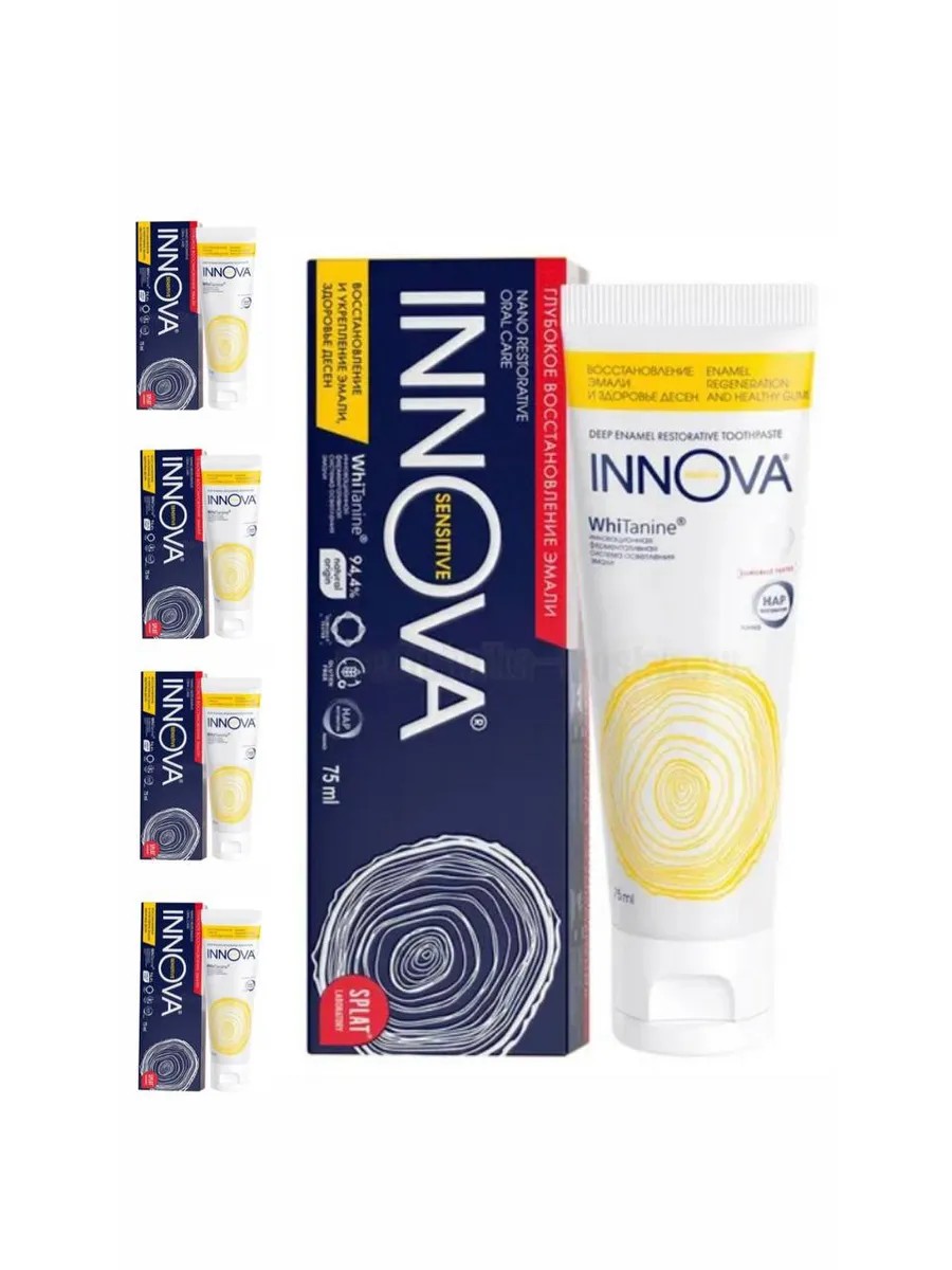 SPLAT представляет инновацию - Серию средств для глубокого восстановления эмали и снижения чувствительности зубов после первого применеия: INNOVA «Жидкая пломба».Укрепляющая зубная паста Иннова восстановление эмали и здоровье десен с терапевтической дозировкой Гидроксиапатита (2,25%) в активной наноформе действует подобно жидкой пломбе: проникает глубоко в открытые дентинные канальцы и полностью их закрывает, укрепляет эмаль, снижает чувствительность зубов, в том числе в пришеечной области, а также снижает кровоточивость и воспаление десен*.Внешний вид и свойства:• Консистенция - паста• Цвет - светло-желтыйСпециальные особенности:Не содержит: SLS, ФТОР, хлоргексидин, триклозан, соли калия, соединения алюминия, карбонат кальция, агрессивные абразивы, фосфаты и пирофосфаты, сахаринат натрия, соединения пероксида.Уникальная комбинация компонентов• Для восстановления эмали:- Активный наногидроксиапатит в терапевтической дозировке (2,25%) является точной копией строительного вещества зубной эмали, егоаморфная форма проникает в открытые дентинные канальца и закупоривает их, решая тем самым проблему чувствительности зубов. А также проникает глубоко в повреждения на поверхности зубов и очаги деминерализации, укрепляя эмаль и делая её более плотной.- Кальцис значительно увеличивает реминерализацию эмали, не раздражая слизистую оболочку полости рта.• Экстракт косточек красного винограда эффективно защищает от кариеса• Инновационный фермент Танназа бережно осветляет эмаль, разрушая красящие вещества - танины, которые содержится в чае, кофе, табаке и фруктах.• Экстракт стевии, нима бадана, шлемника и полифенолы (Эвкалиптол, Тимол, Анетол) заботятся о ДЁСНАХ, снимая кровоточивость и воспаление.Закупоривает дентинные канальца, решая проблему чувствительности зубов уже после первого применения, а также снижает кровоточивость и воспаление десен.Эффективность:- Очищающий эффект - 70,9%- Десенситивное действие - 64,4%- Реминерализующая эффективность - 50%-