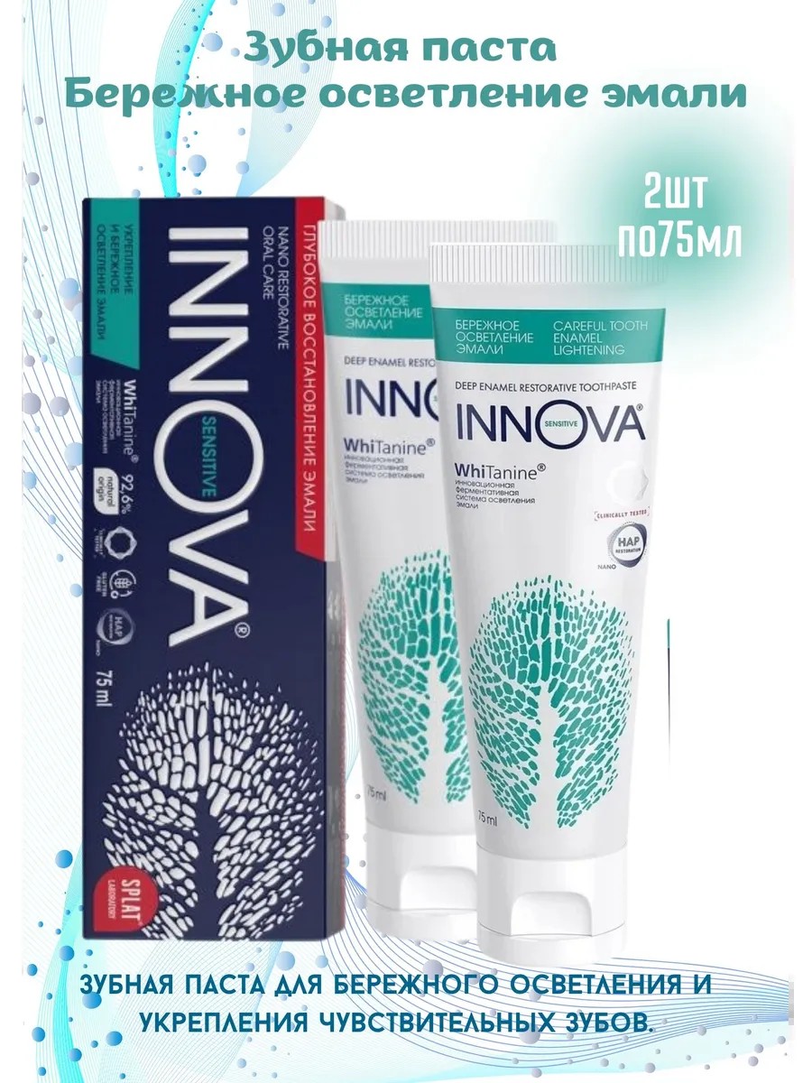 Innova Strengthening Toothpaste Gentle enamel whitening with a therapeutic dosage of Hydroxyapatite (2.25%) in active nanoform acts like a liquid filling: it penetrates deep into open dentinal tubules and completely closes them, strengthens enamel, reduces tooth sensitivity, including in the cervical area, and whitens enamel.