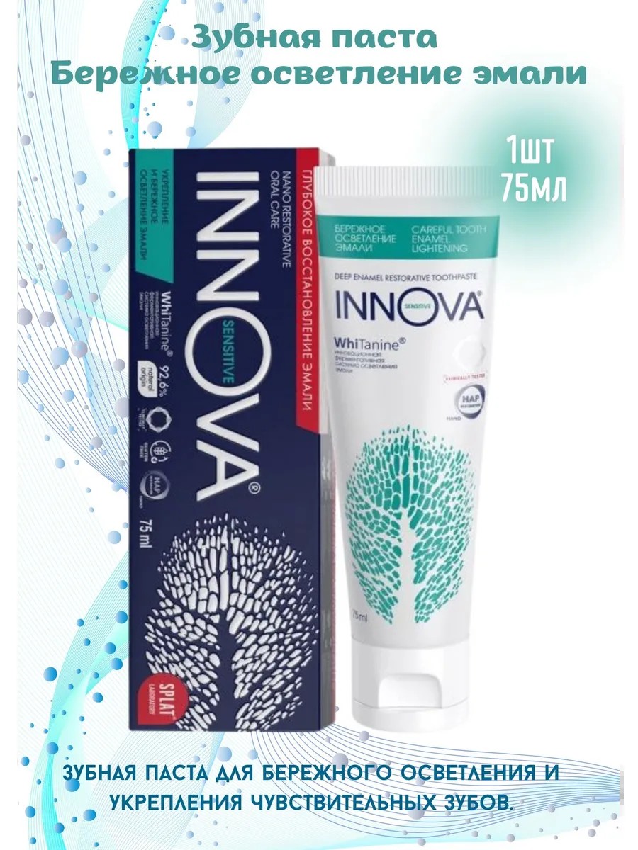 Innova Strengthening Toothpaste Gentle enamel whitening with a therapeutic dosage of Hydroxyapatite (2.25%) in active nanoform acts like a liquid filling: it penetrates deep into open dentinal tubules and completely closes them, strengthens enamel, reduces tooth sensitivity, including in the cervical area, and whitens enamel.