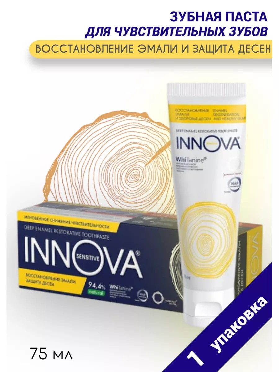 INNOVA Toothpaste: Enamel Restoration and Gum Health - Innova toothpaste with a therapeutic dose of Hydroxyapatite (2.25%) in active nanoform penetrates deep into open dentinal tubules and completely closes them, strengthens enamel and reduces tooth sensitivity, including in the cervical area. Active ingredients: - Active nanohydroxyapatite in a therapeutic dose (2.25%) and Calcis restores enamel - Red grape seed extract effectively protects against caries - Innovative Tannase enzyme gently brightens enamel - Stevia extract and polyphenols (Eucalyptol, Thymol, Anethole) care for gums
