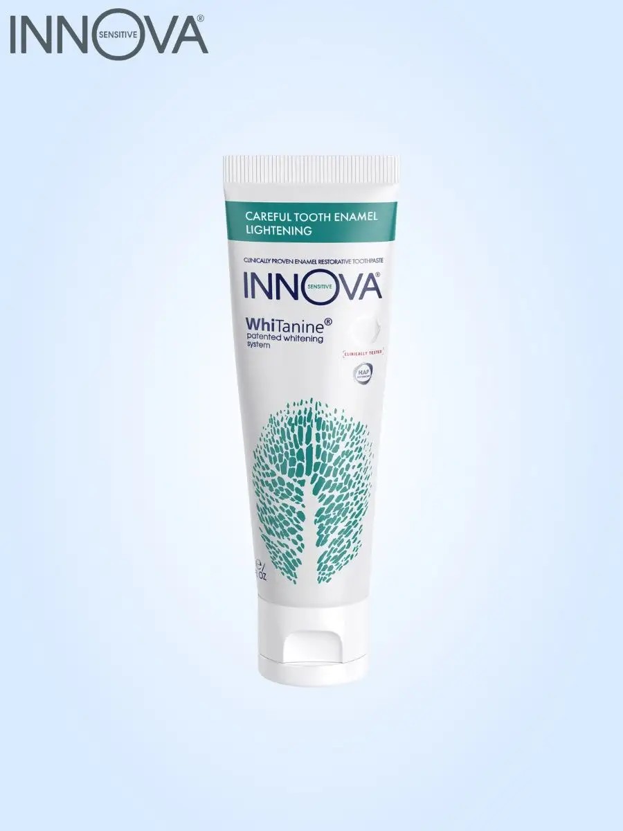 Innova Gentle Enamel Whitening Nano-Restorative Toothpaste for Sensitive Teeth contains amorphous nano-calcium hydroxyapatite, which penetrates and fills enamel microcracks. A 2.25% dosage ensures effective enamel restoration. Grape seed extract protects against caries. The whitening enzyme Tannase gently whitens enamel. The high-molecular component Polydon and stevia extract provide comprehensive mucosal care. Calcium hydroxyapatite is the main mineral of bone and hard dental tissue, found in virtually all body fluids. The formula does not contain SLS, chlorhexidine, triclosan, potassium salts, aluminum compounds, calcium carbonate, aggressive abrasives, phosphates and pyrophosphates, sodium saccharinate, or peroxide compounds. This toothpaste is 90.1% natural.