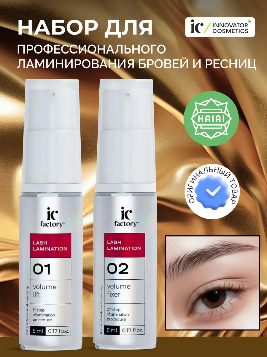 В набор входят два состава: 1) VOLUME LIFT IC FACTORY — первый этап ламинирования. Активный компонент цистеамин защищает клетки кожи от вредного воздействия окружающей среды, обеспечивая бережный уход. 2) VOLUME FIXER IC FACTORY — второй этап. Этот состав проникает в структуру волосков, укрепляет их от корней до кончиков, восстанавливает и стимулирует рост. Питательные компоненты увлажняют, тонизируют и придают эластичность изгибу, а защитная плёнка предотвращает пересыхание и ломкость ресниц.