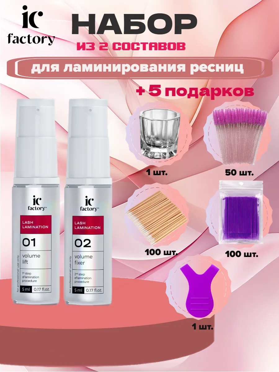 Состав #1 для ламинирования ресниц и VOLUME LIFT IC FACTORY используется на первом этапе ламинирования ресниц. Не содержит тиогликолевую кислоту. Активный компонент первого этапа – цистеамин – представляет собой производное аминокислоты, аналог структурного белка цистина.Он защищает клетки кожи от вредоносного воздействия свободных радикалов, появлению которых способствует ультрафиолетовое излучение и другие негативные факторы окружающей среды. Состав #2 для ламинирования ресниц VOLUME FIXER IC FACTORY используется на втором этапе ламинирования ресниц. Не содержит перекись водорода. Активный компонент – бромат натрия. Проникает в структуру волоска и фиксирует дисульфидные связи на длительный срок, укрепляет и восстанавливает волоски от корней до самых кончиков, благодаря содержанию питательных компонентов: Hydrolyzed Keratin — питает фолликулы, стимулирует рост и регенерацию волосков. Vitis Vinifera Seed Oil — масло виноградной косточки — увлажняет, тонизирует, повышает упругость и эластичность. Dimethiconol - покрывает волос защитной пленкой, препятствует его высыханию и ломкости. Состав #3 для ламинирования ресниц NOURISHING ESSENCE IC FACTORY используется в качестве завершающего этапа ламинирования ресниц. Обволакивает каждую ресницу и фиксирует завиток. Состав позволяет дополнительно очистить ресницы от остатков клея и краски. Срок хранения после вскрытия — 9 месяцев. В закрытом виде — 24 месяца. Расход — 30 процедур на каждый состав. Каждая партия проходит несколько этапов тестирования. В подарок к каждому набору идут 50 щеточек для расчесывания бровей и ресниц.